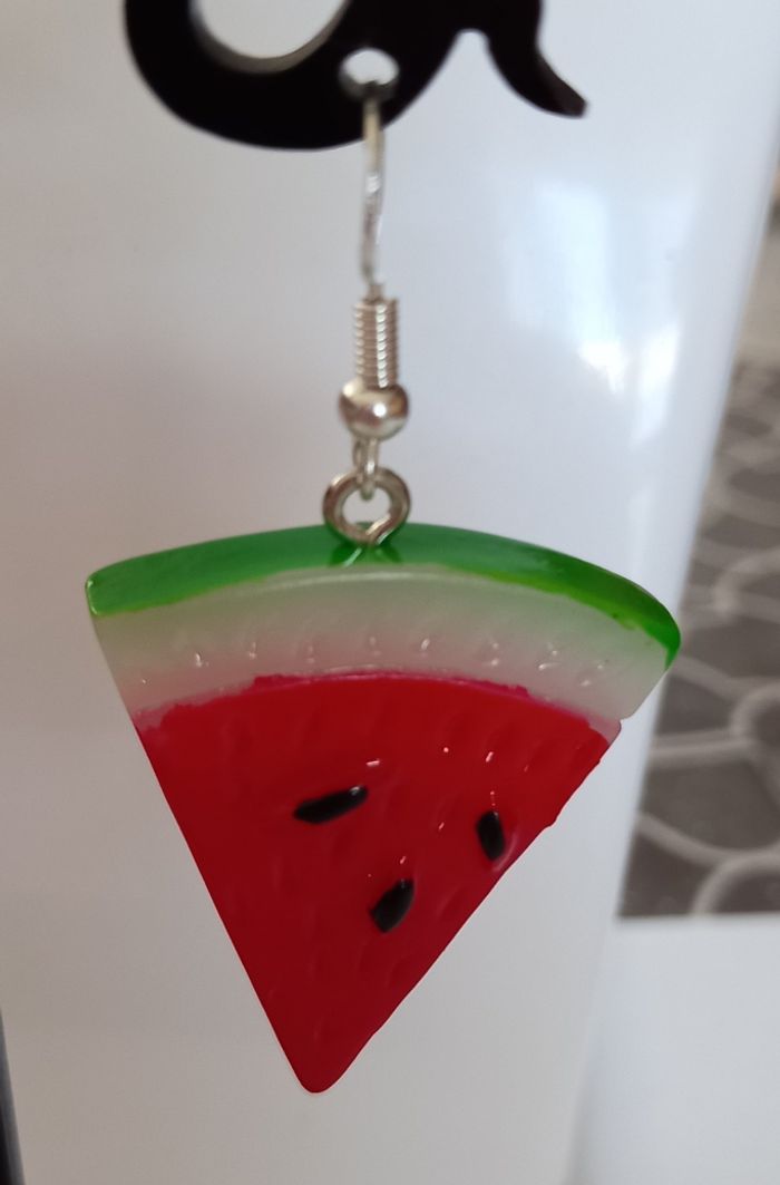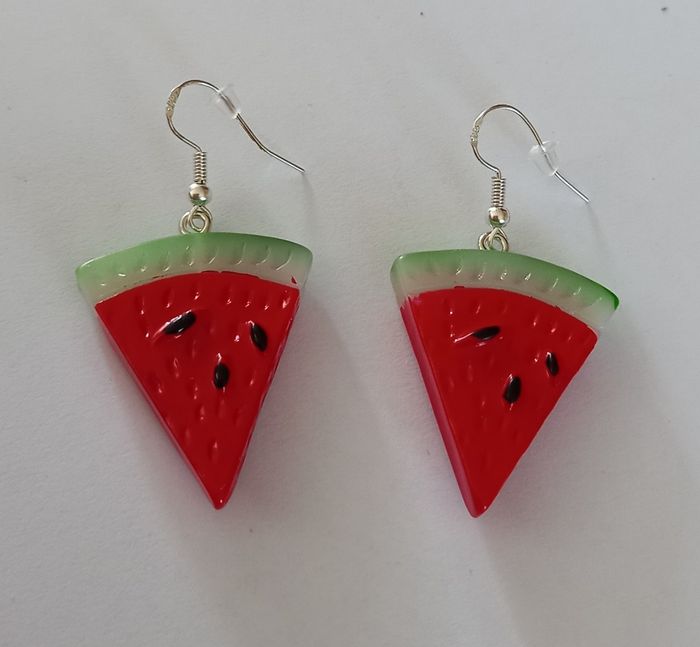 Tige en alliage coloris argenté. Motif tranche de pastèque. Hauteur : 5,2 cms. Dimensions de la pastèque : 3,2 x 2,8 cms. Boucles neuves sous blister. N'hésitez pas à regarder mes autres ventes. Envoi rapide et soigné.