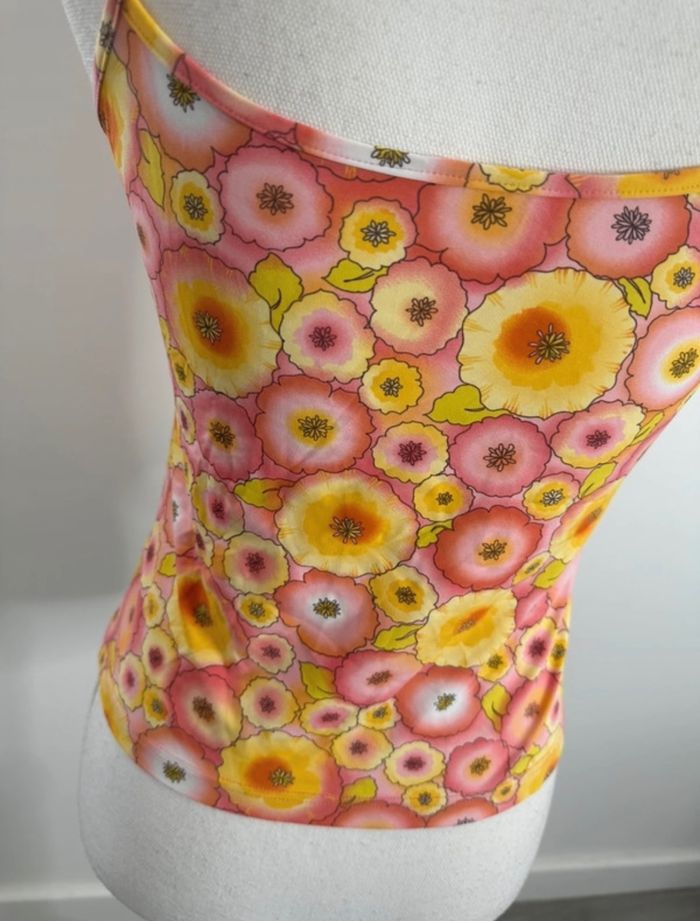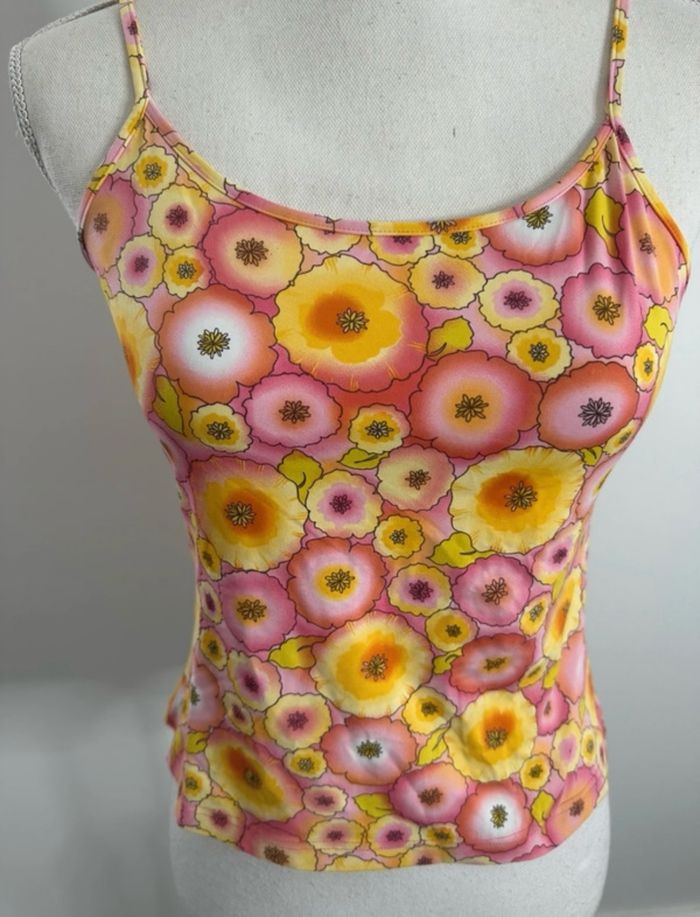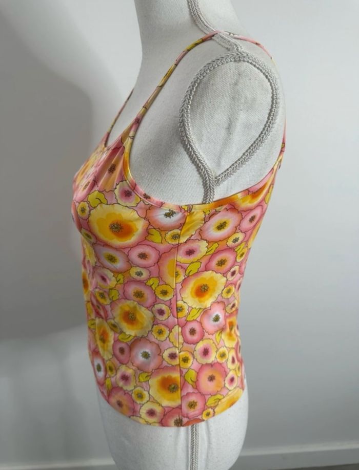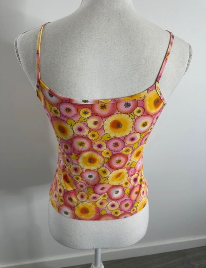 Débardeur court - Excellent état - Taille 40 équivalent L - Imprimés fleurs - Jaune et rose - Fines bretelles - Tissus super stretch - Y2K, années 2000' - Style psychédélique - Pas d'étiquette de taille ni de matière