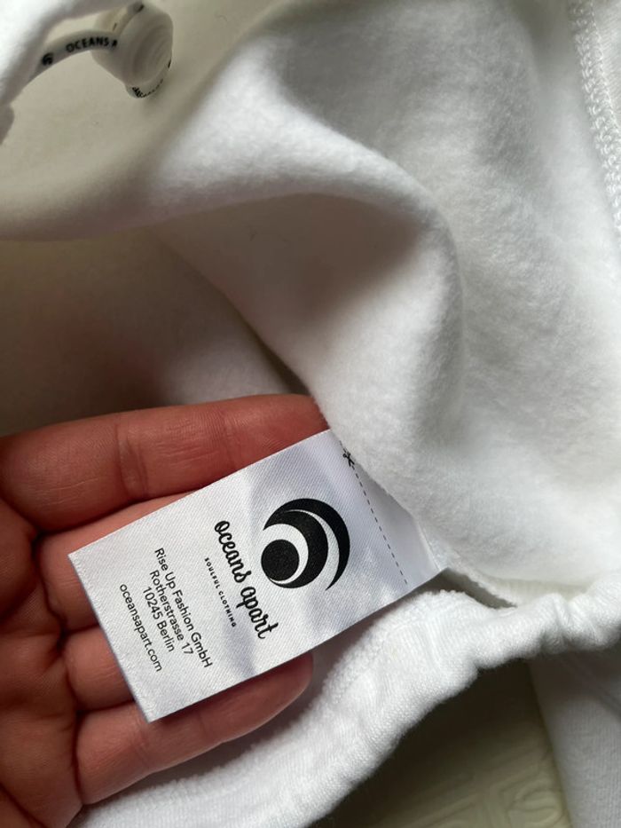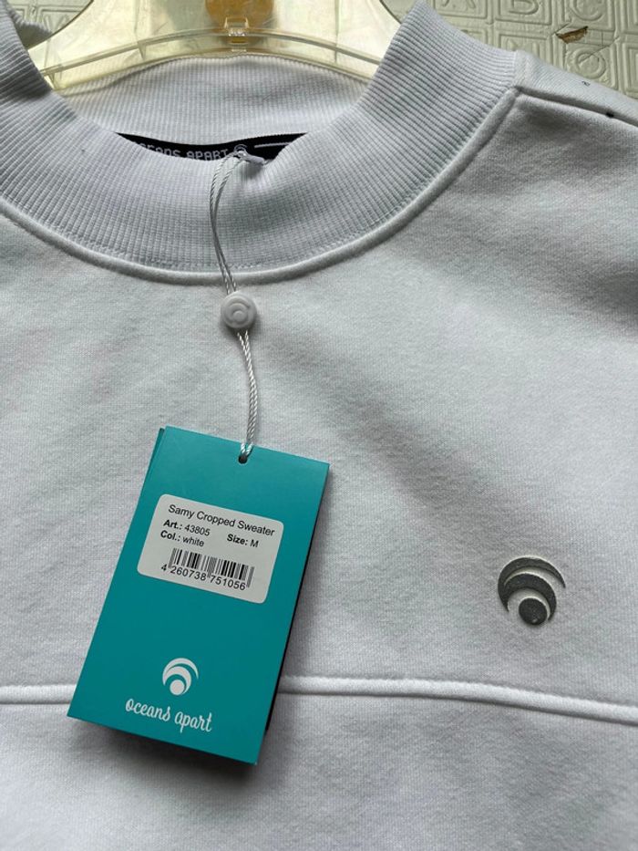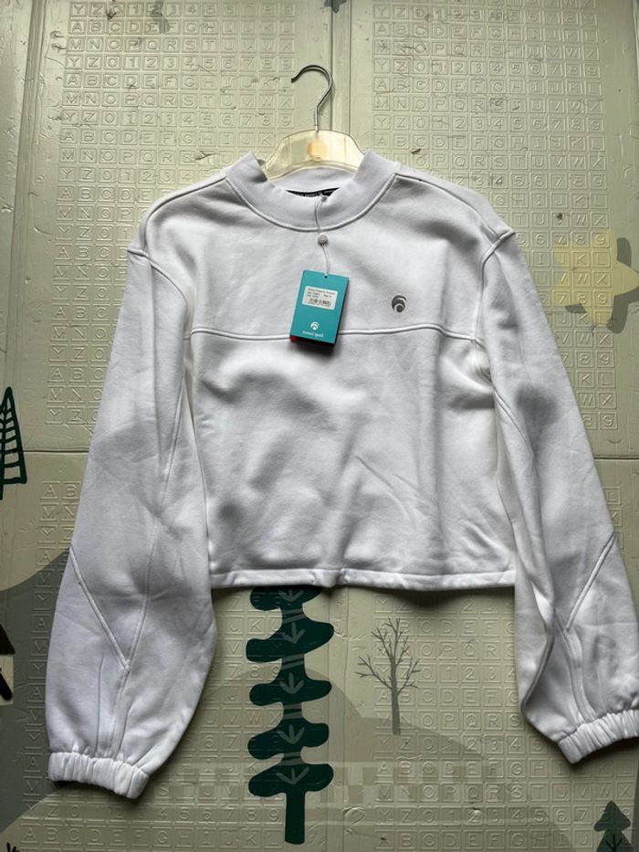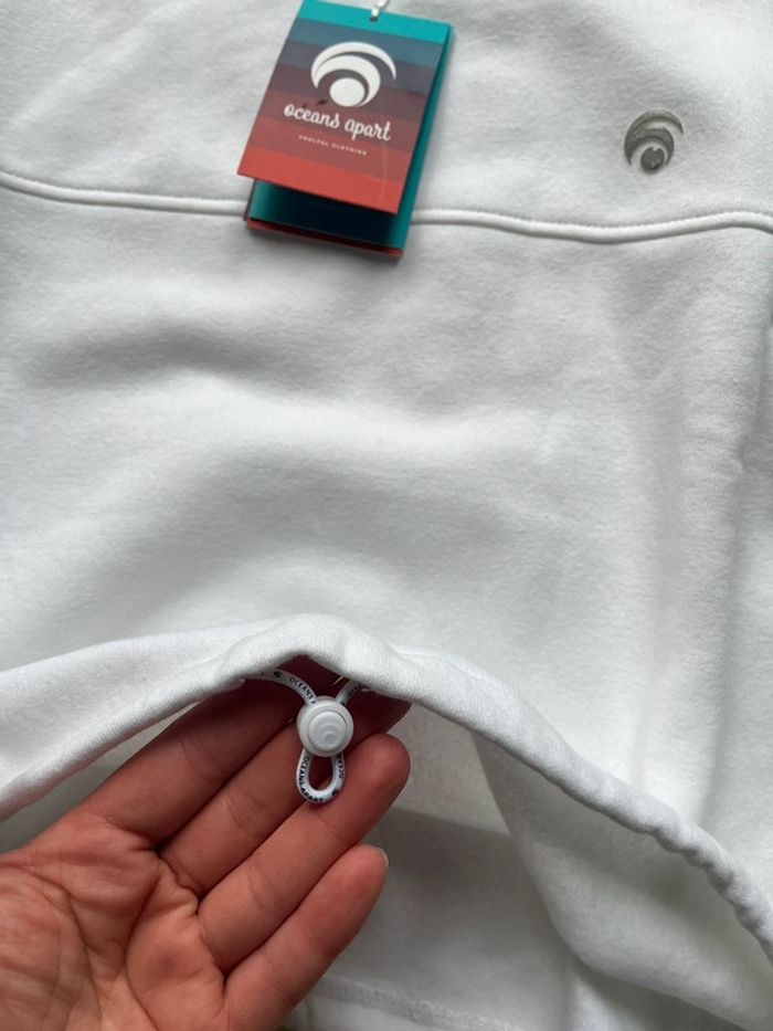 Longueur courte Col montant côtelé Sweat Oceans Apart Neuf avec étiquette Taille M Couleur Blanc Ligne de découpe sur la poitrine et les manches Cordon de serrage à l'ourlet pour un ajustement personnalisé Intérieur brossé, très douillet Sensation douce au toucher 80% Coton bio, 20% Polyester