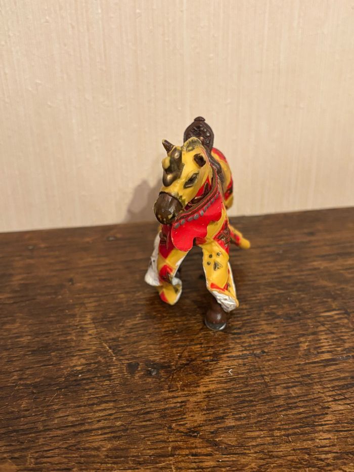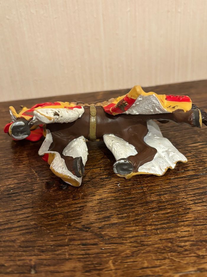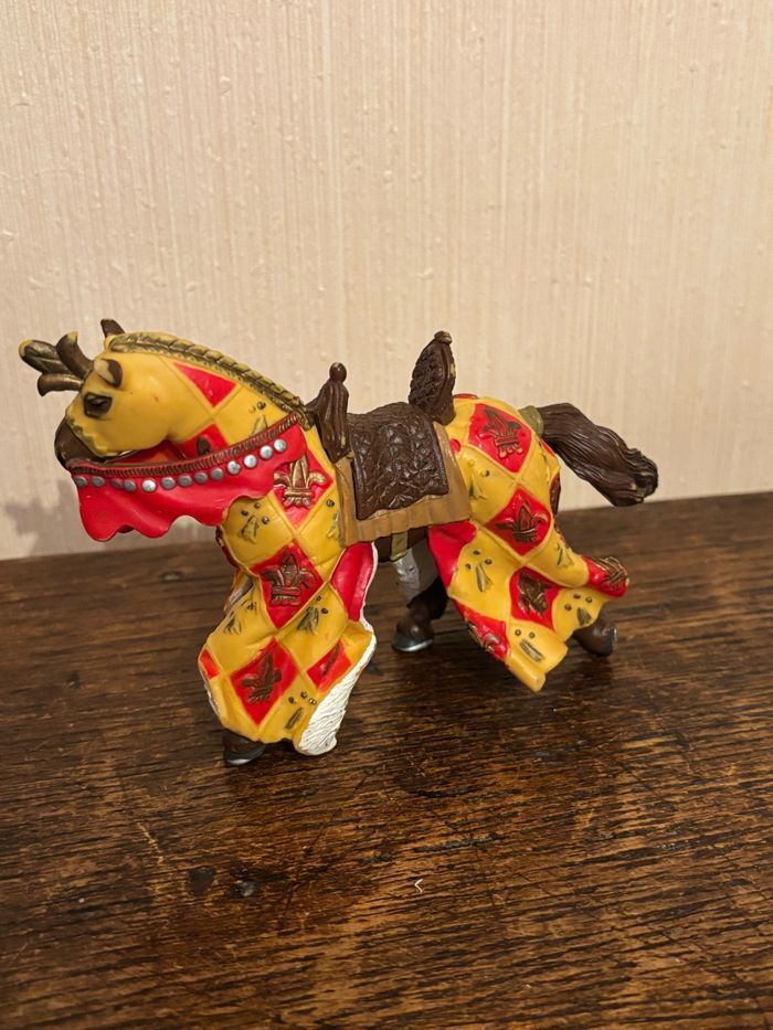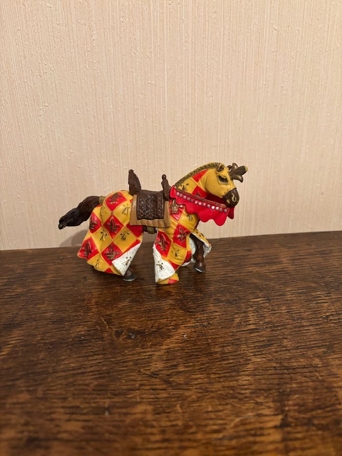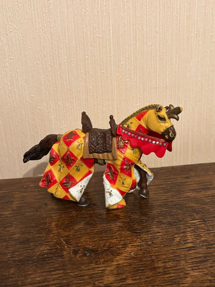 Vend figurine Cheval marron avec fleur de lys jaune et rouge en plastique peint à la main Marque: PAPO Dimensions : 14 x 9 x 5 cm env. Vendu SANS chevalier À été utilisé mais reste en très bon état. Maison non fumeur et sans animaux. Vendu 3€