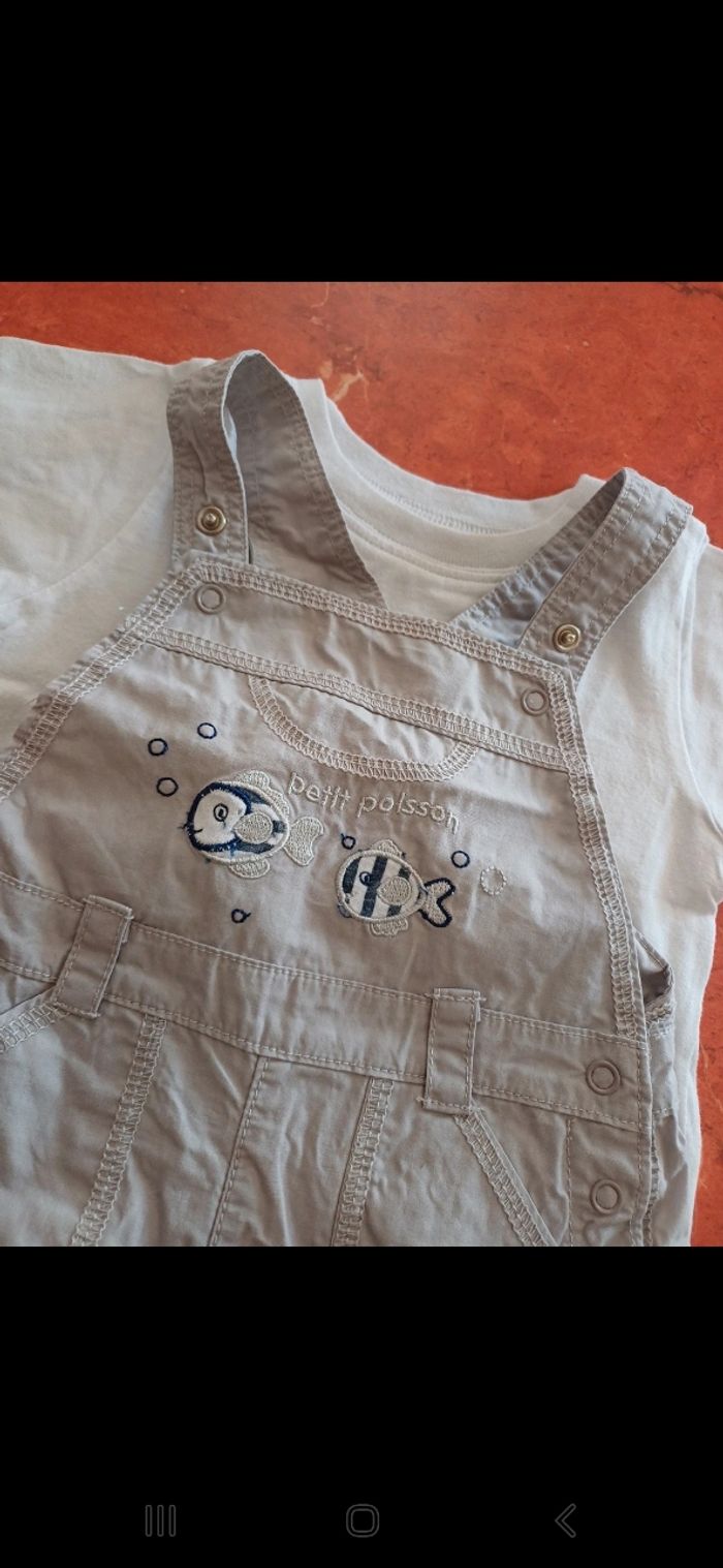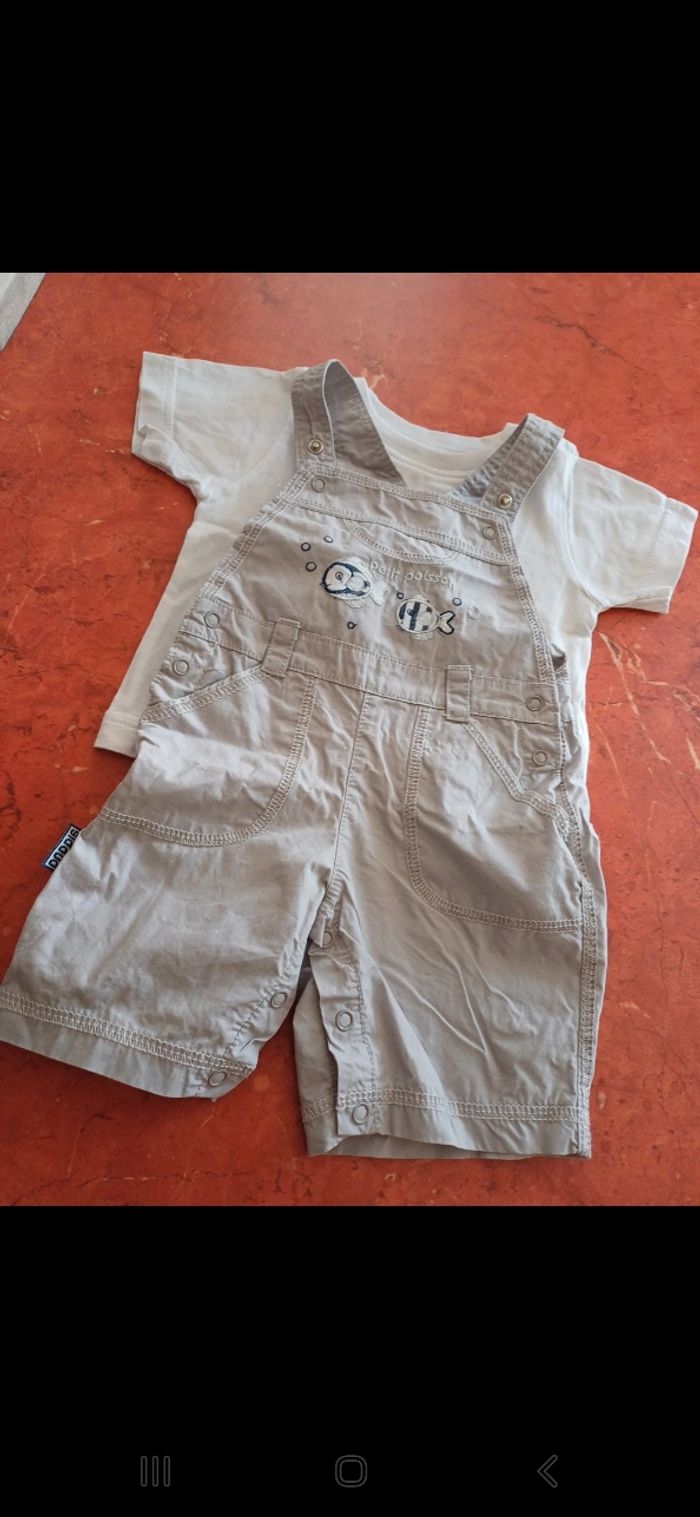 Ensemble comprenant un t.shirt manches courtes et une salopette courte réglable au niveau des bretelles.