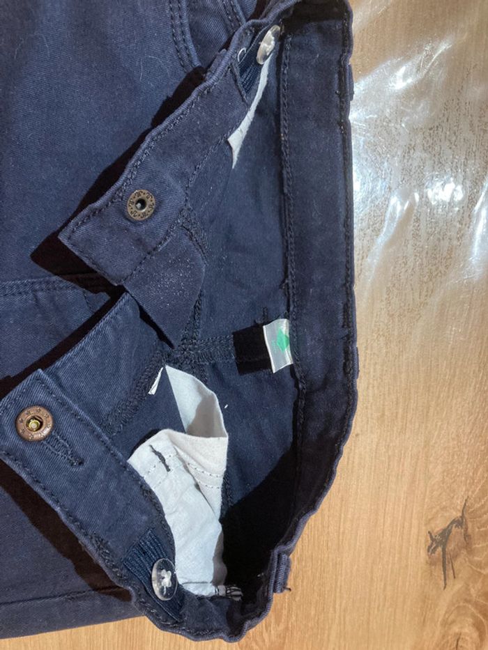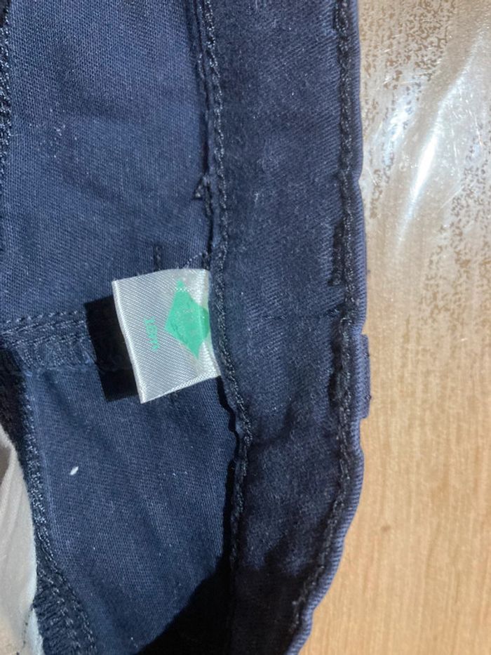 Jean bleu marine, fermeture par un bouton pression. Réglable à l’intérieur par un bouton de chaque côté. Taille 18 mois 98% coton et 2% elasthanne Bon état
