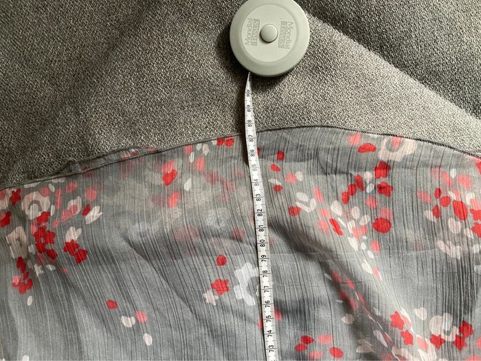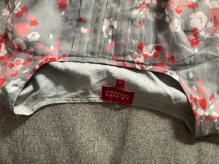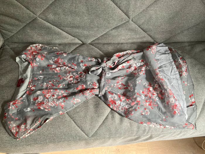 Robe grise avec imprimés rose et rouge , voile avec doublure grise en dessous,taille 36, marque La City. Peu portée