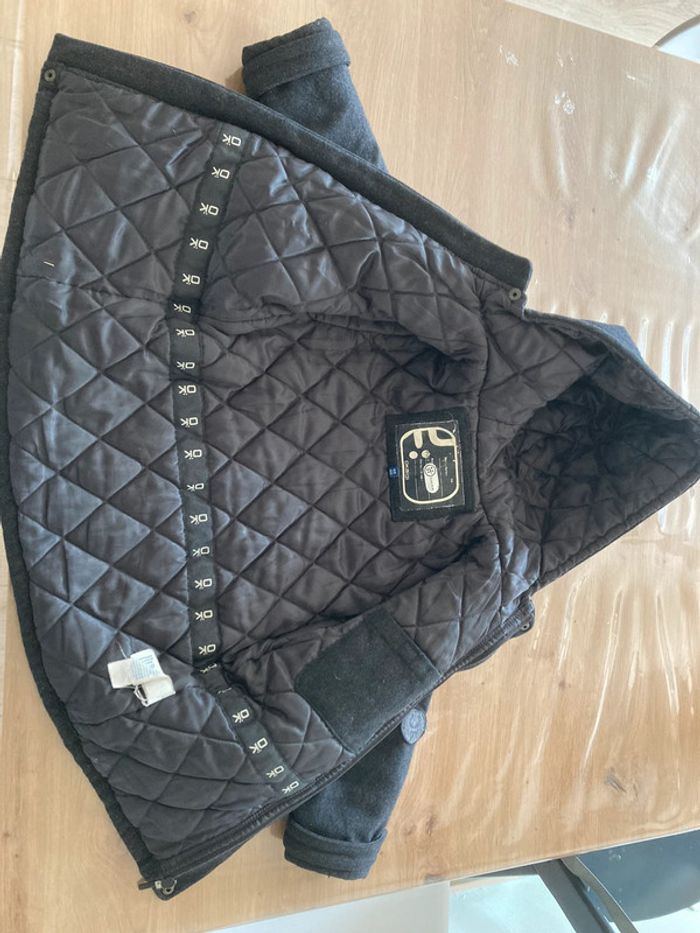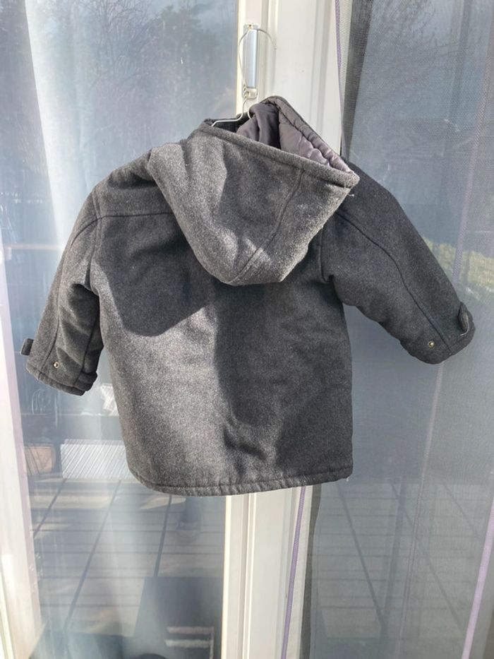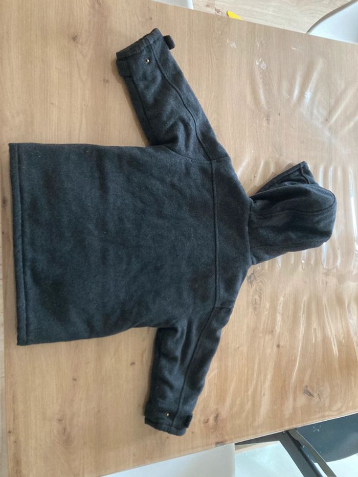 Duffle-coat gris foncé , marque okaidi , taille 4 ans - 102 cm , 2 poches à rabat en bas sur le devant et 2 poches en haut . Très bon état : porté quelques fois.