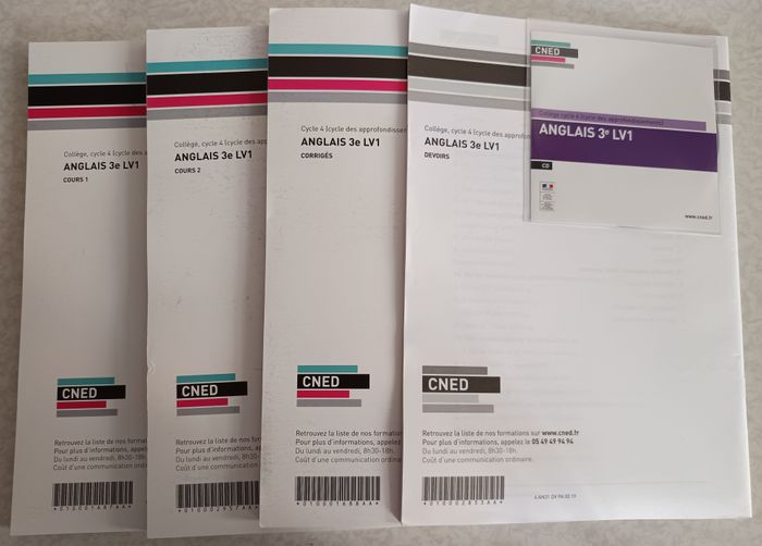 Lot Complet de 5 articles CNED pour collège 3ème pour la matière Anglais LV1 comprenant : Cours 1 et 2 Corrigés Devoirs CD Audio Les articles sont en très bon état général Ecriture sur le coté pour repérage facile (voir dernière photo)