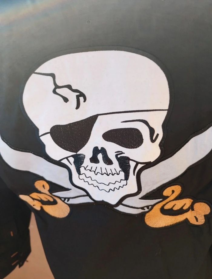 Très bon état mesure à plat épaule à épaule 43cm sous aisselles 53cm longueur totale 73cm. La tête de mort est mouchetée gris sur le blanc #chialistahommel