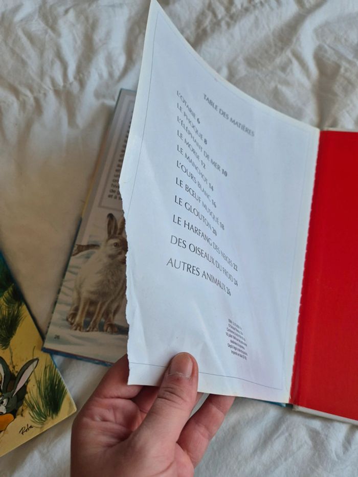 Livre sur les animaux une page à la fin abîmé sinon le reste en bon état