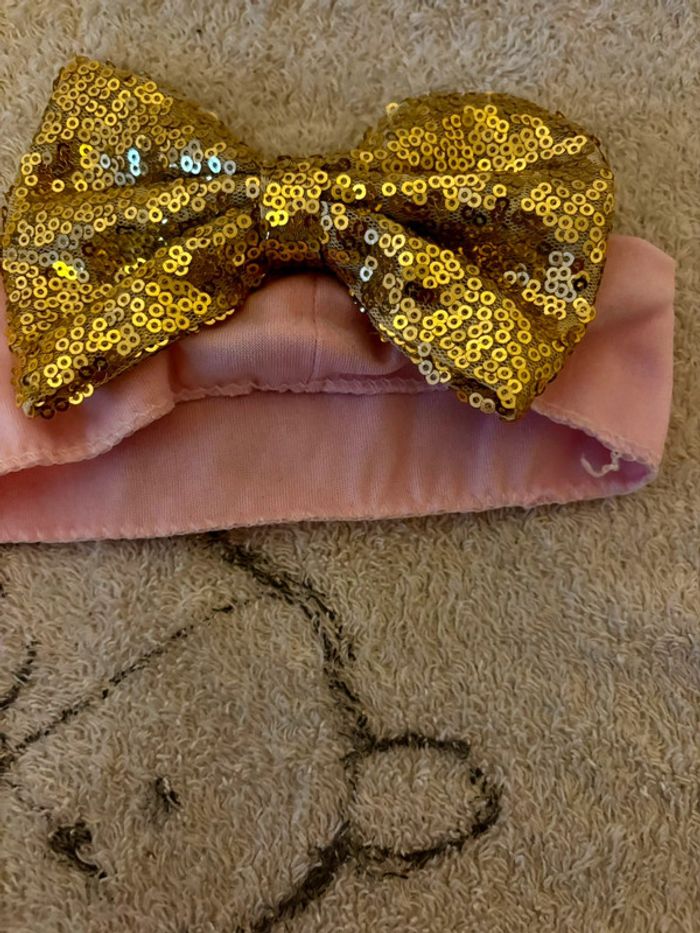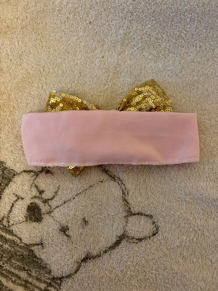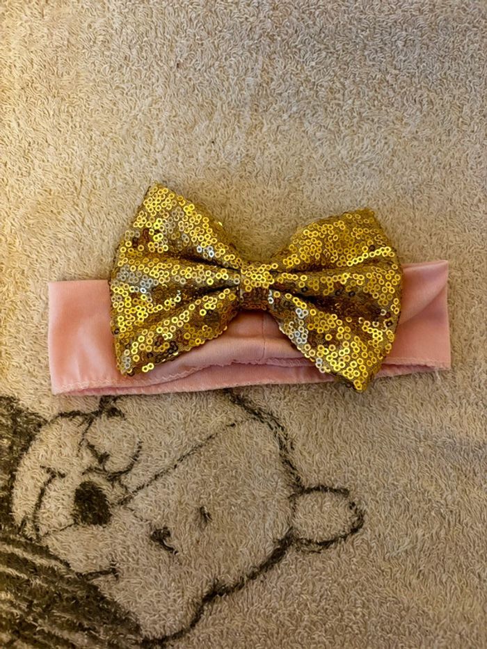 Bandeau bébé fille taille unique avec noeud doré en sequins Très bon état Réductions actives sur les lots #bandeau #bébéfille #sequins