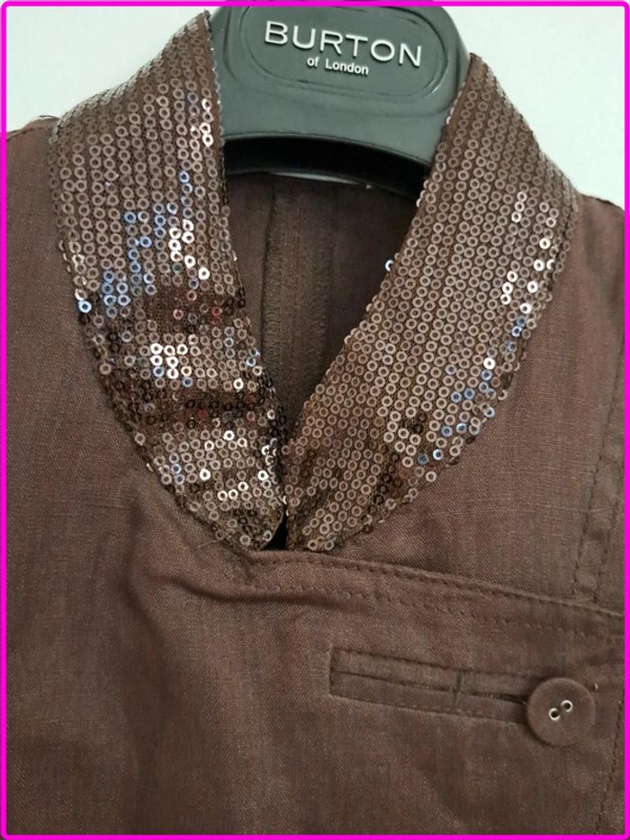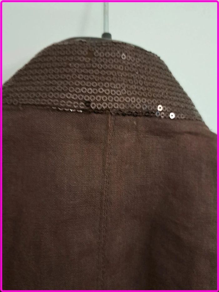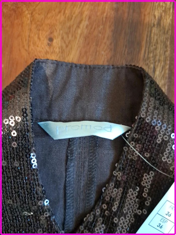 Encore 1 fois achetée et jamais portée.. j'ai gratté pour voir le prix voir photos. Y a même encore les boutons de remplacement. Quelques finitions sequins sur les poches et col.