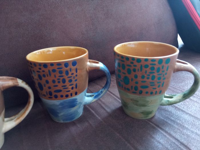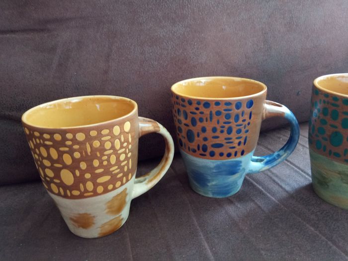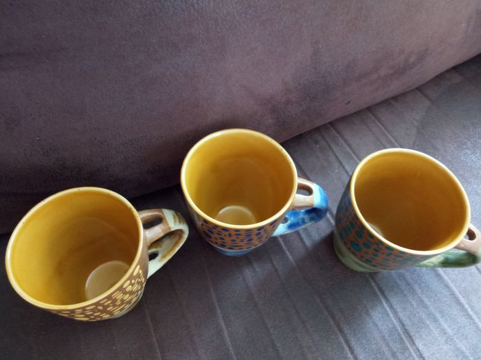 3 jolis MUGS originaux Couleur: Multicolore (3 couleurs différentes comme sur les photos) Dimensions: Hauteur: 10,5cm - Diamètre: 8,5cm Tendance Un repose-cuillère intégré dans l'anse (cuillère non fournie) Mugs en parfait état, peu servis (le Mug Jaune/Marron/Beige est légèrement ébréché en-dessous, ne se voit pas quand il est posé sur la table)