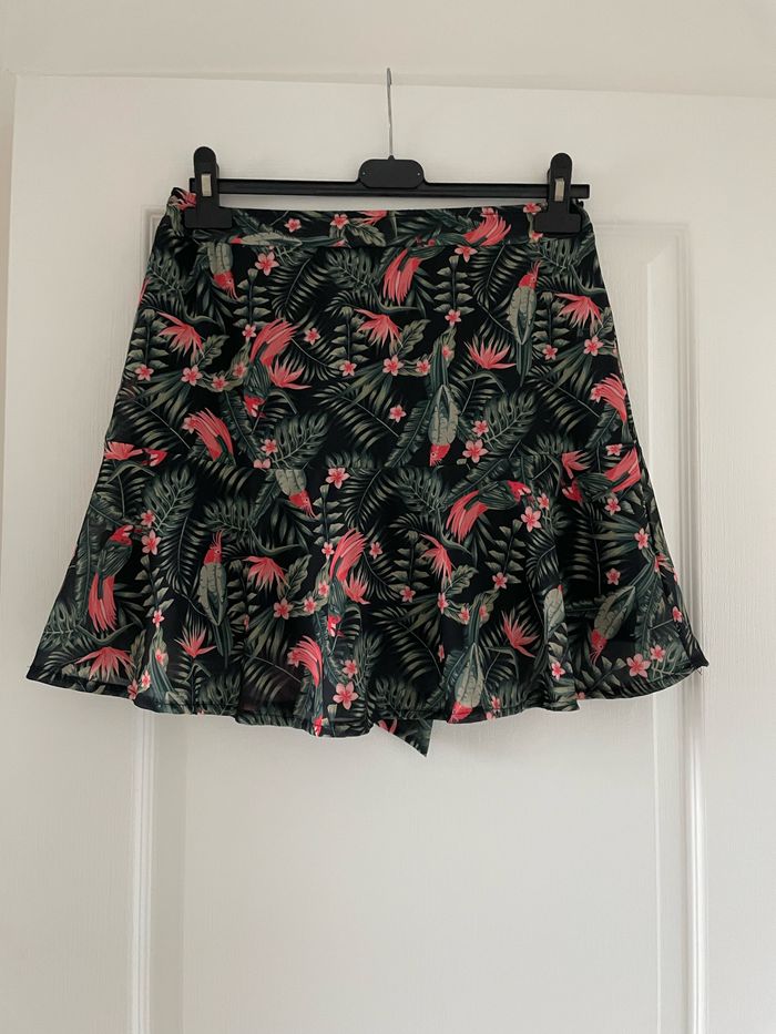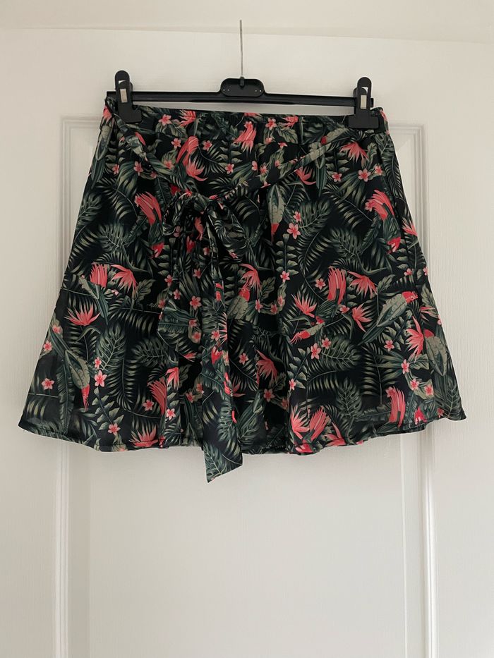 Jupe noire fleurie avec doublure intérieure et ceinture, en très bon état. Longueur : 44cm Marque : Cloothes Taille : S