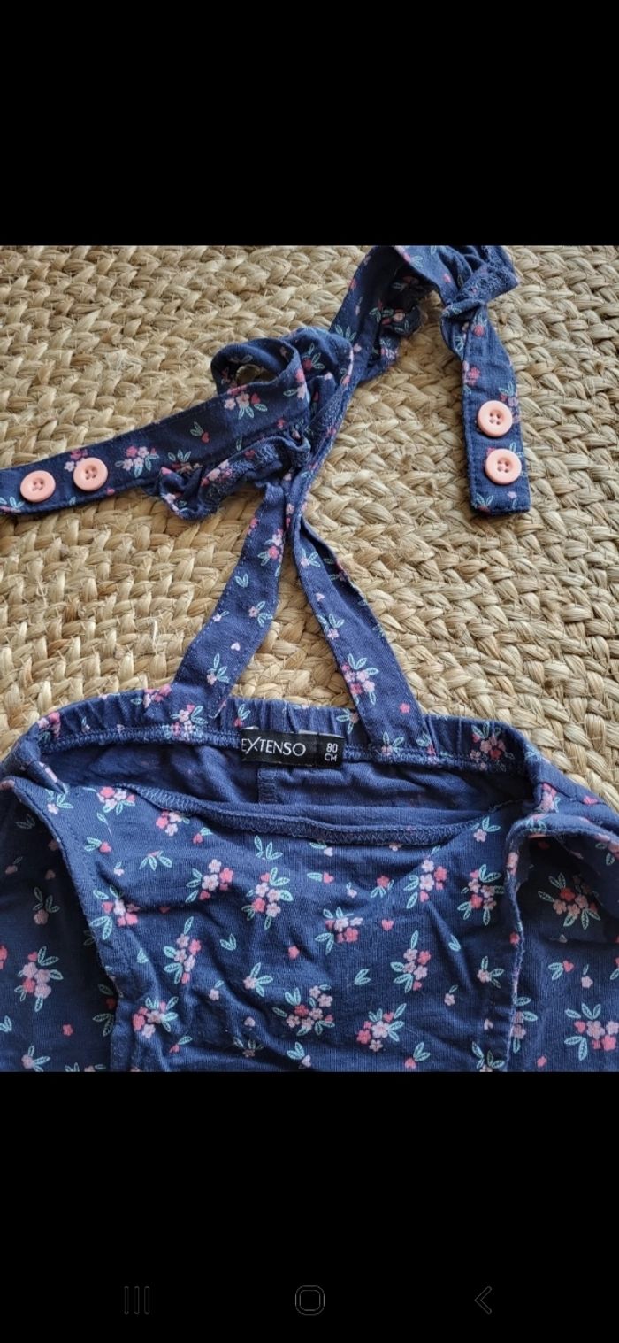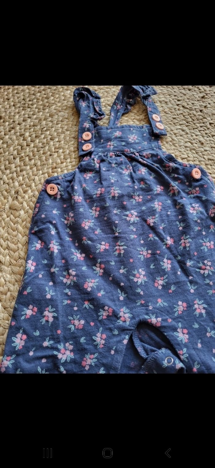 Salopette fleuri. Très bon état. Boutons sur les côtés et pression entre jambe. Les bretelles se défont pour plus de praticité. Légère idéal été