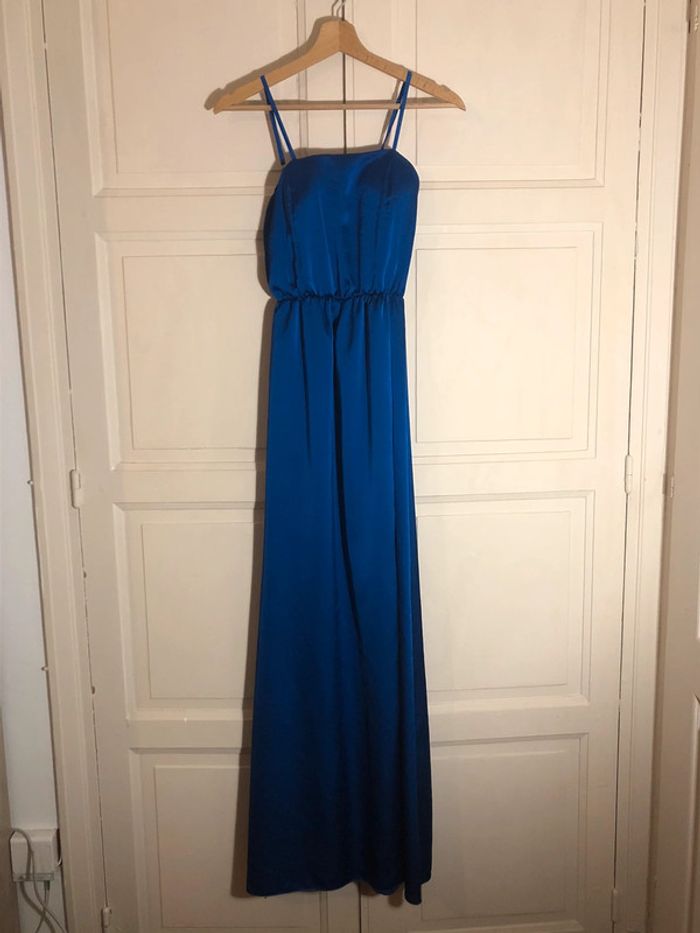 Longue robe bleue satin, fente en bas. Portée une fois pour un mariage, très bon état