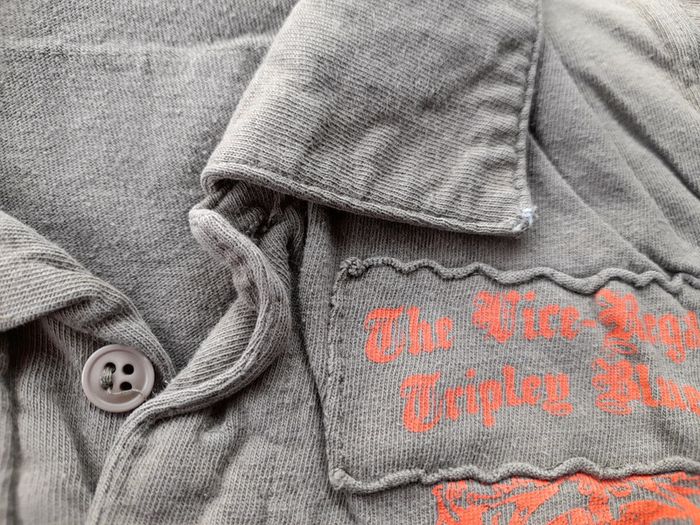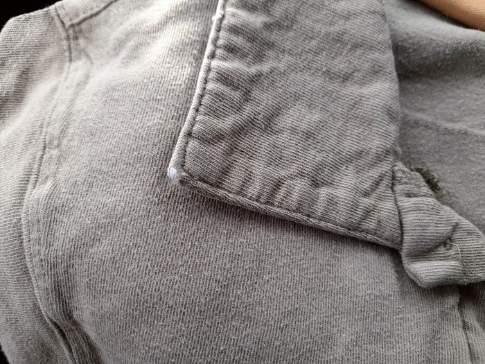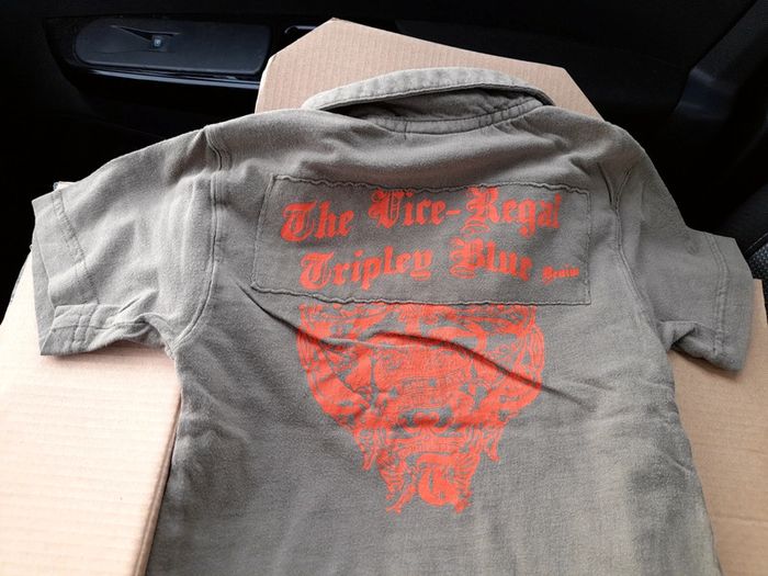 Manches courtes. Usure du tissu aux pointes du col, visible sur photos. De couleur kaki avec écriture orange au dos et devant.