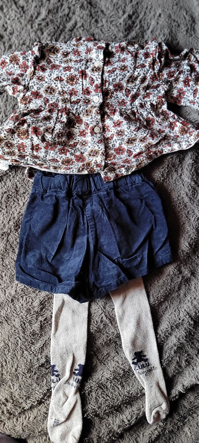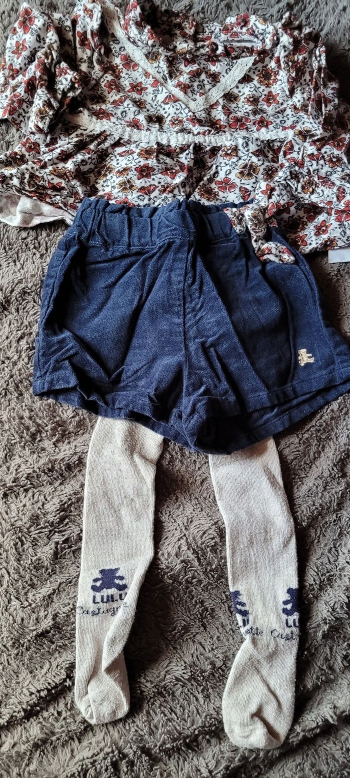 Ensemble short en velours , collant, blouse Bleu marine , beige , blanche fleuries Lulu Castagnette 6 mois