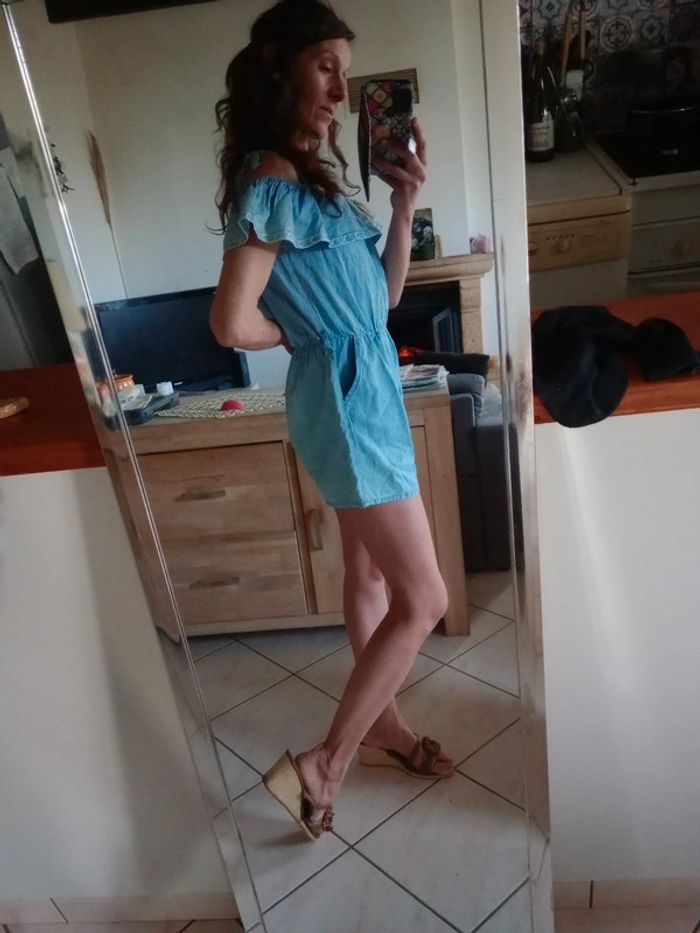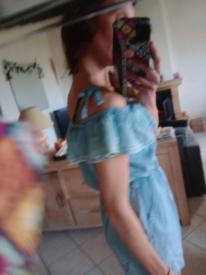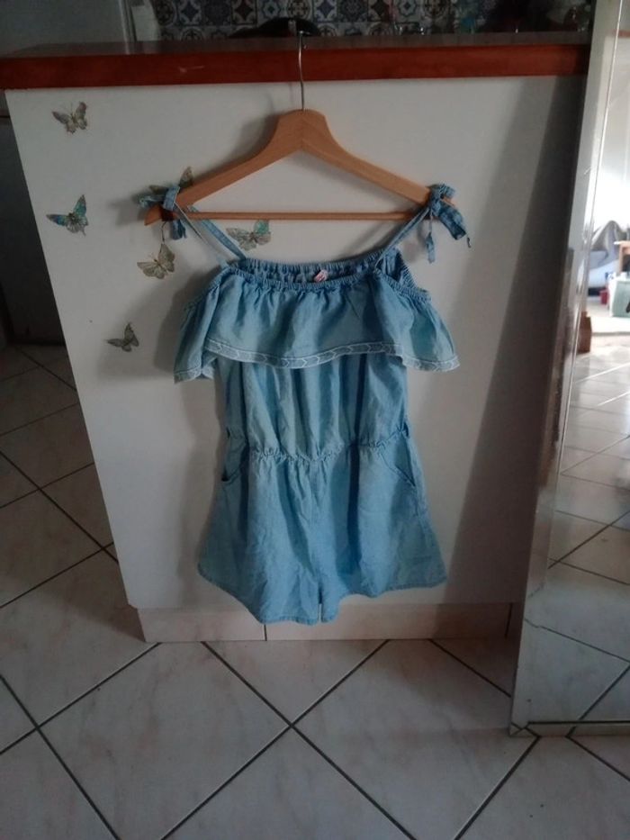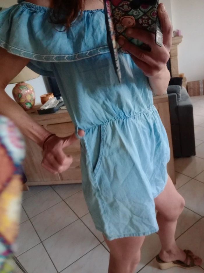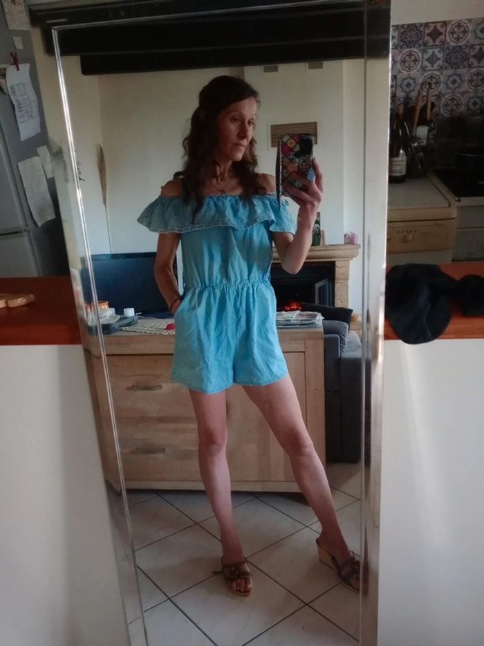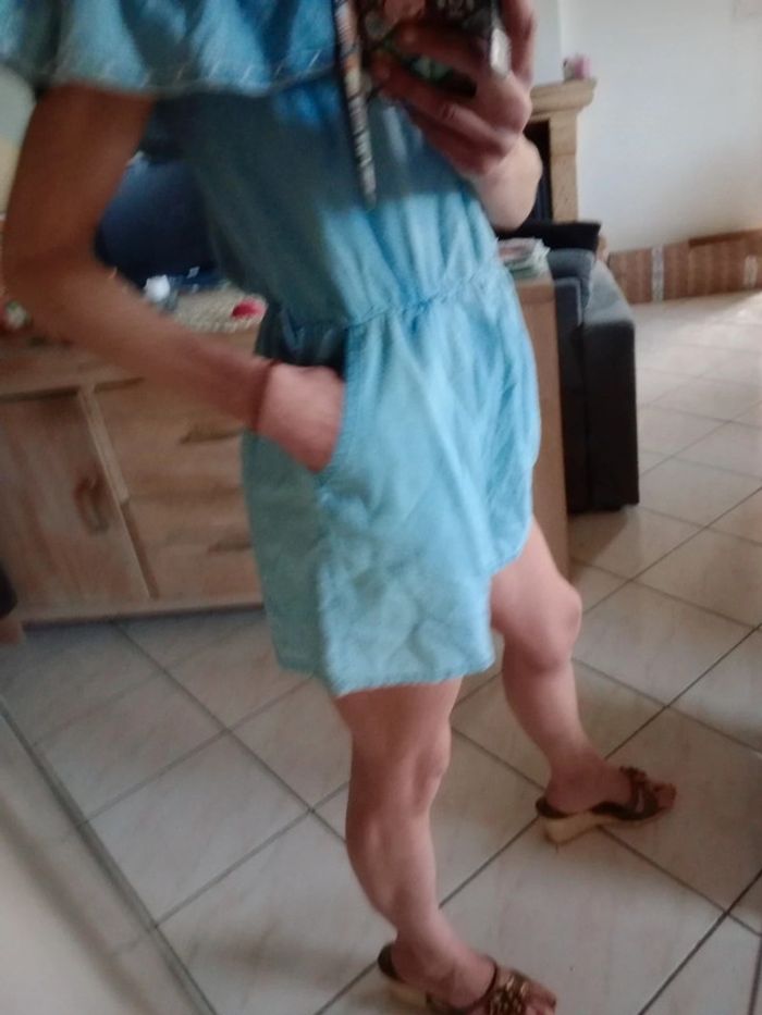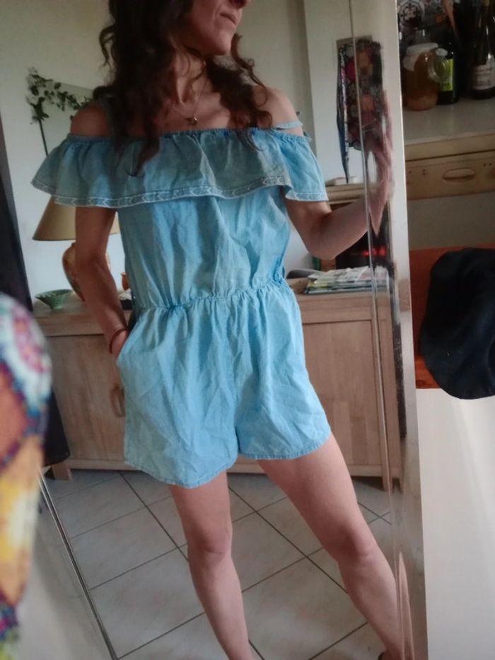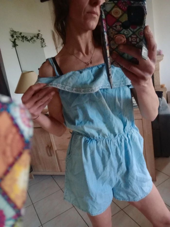 Magnifique pièce 🤩 Super sympa pour l'été Des bretelles réglables en faisant un nœud Un large bandeau il tombe au niveau du col Présence de deux poches Possibilité de mettre une ceinture ou un bandana au niveau de la taille Au niveau de la taille élastique Imitation jean mais ce n'est pas du jean Hauteur 65 cm en prenant du bas de la bretelle au bas du short Aisselle à aisselle à plat 55 cm #carineleray_femme_36