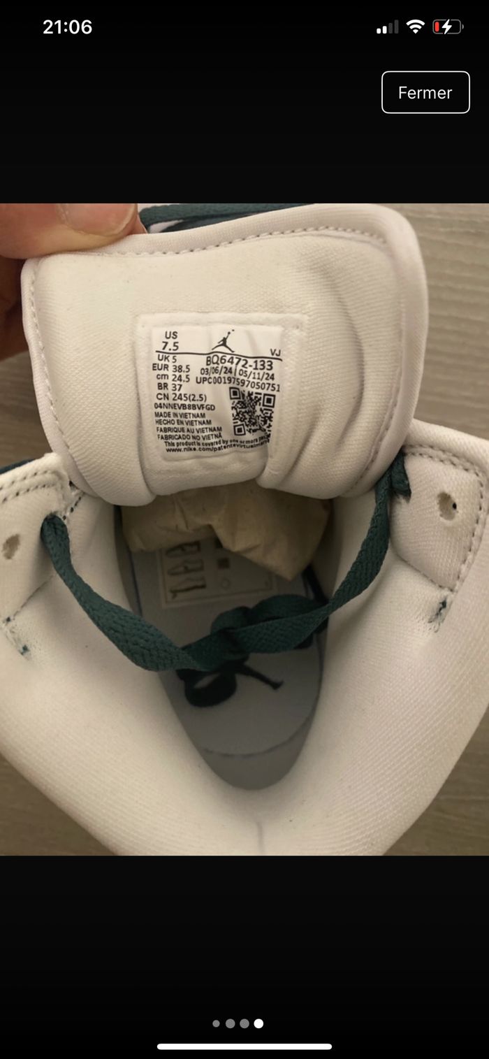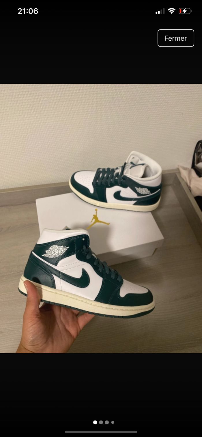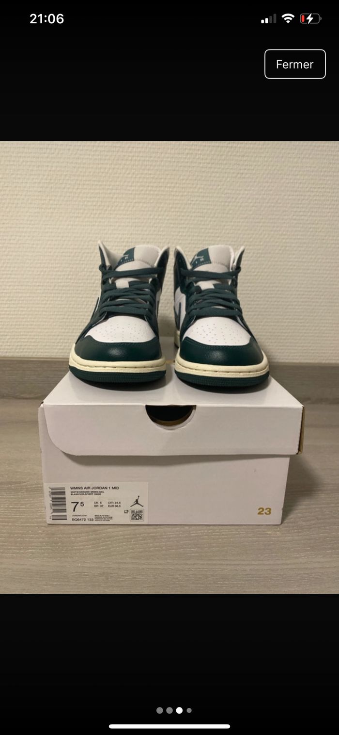 Jordan 1 Mid Taille : 38,5 État : Neuf Couleur : blanc et vert Pour plus d’infos n’hésitez pas à me contacter