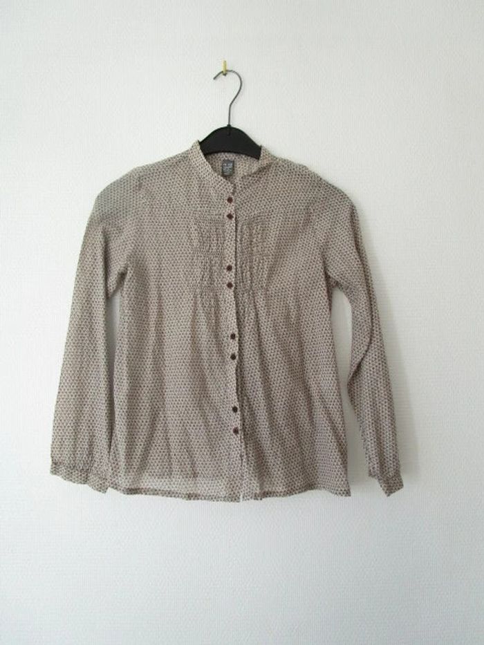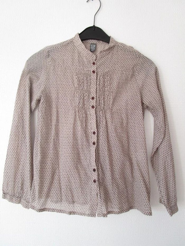 Blouse / chemise col mao de marque Zara taille 12 ans Beige avec fin imprimé chocolat Manches longues Petites fronces sur le devant ainsi que dans le dos 100% coton En parfait état, peu portée #mamanbrade59fille12ans