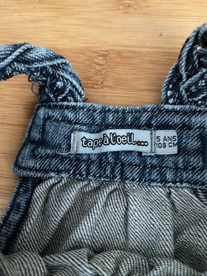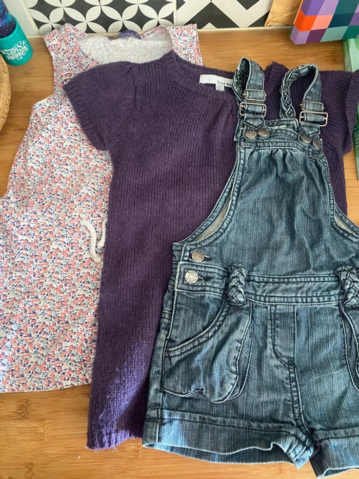 - 2 robes donc une coton à fleurs avec cordon et une robe pull manche courte (a bouloché sur le bas mais reste très jolie). - une combi-short tape à l’œil jean léger avec très jolies détails tresses Pour petite fille au printemps mi-saison