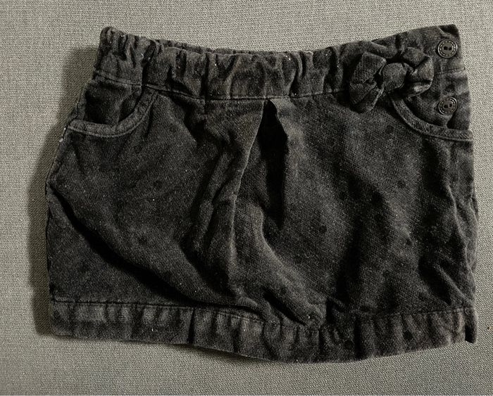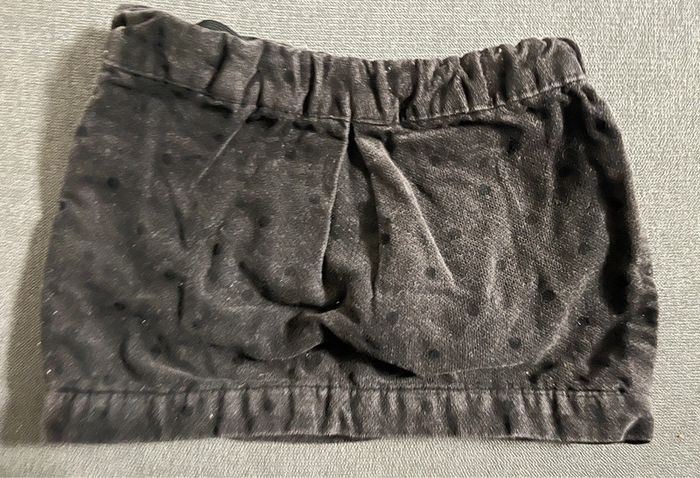 Jupe en velours noire à pois en parfait état. Poche devant des 2 côtés petit noeud au niveau de la taille, boutons pour ajuster la taille et 2 boutons le côté pour l’habillage #lucie190510bebefille12mois