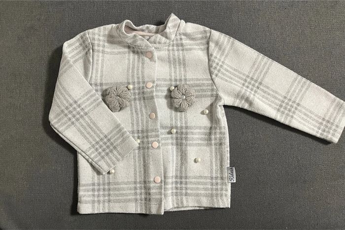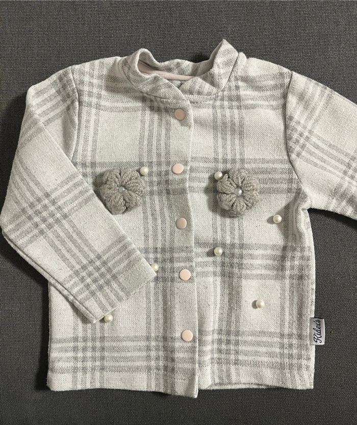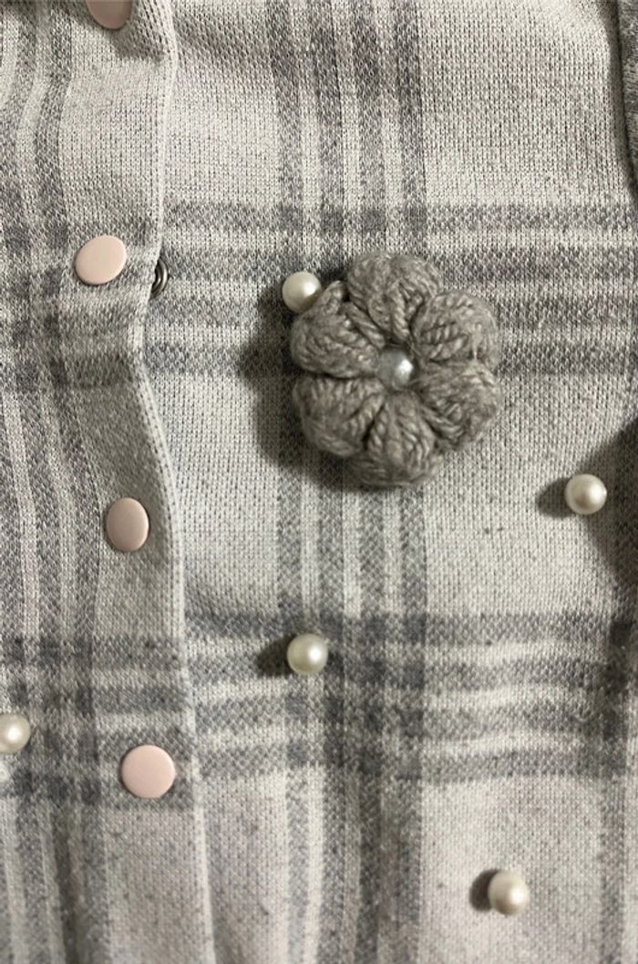 Gilet gris à carreaux en parfait état taille 12 mois. Boutons pressions roses pales, perles sur le devant et fleurs en relief en laine #lucie190510bebefille12mois