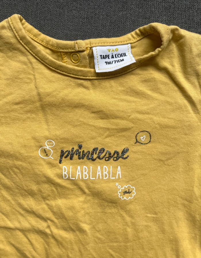 Teeshirt manches longues tape à l’œil princesse bla-bla-bla en parfait état. Boutons pressions tout le long du dos. #lucie190510bebefille9mois
