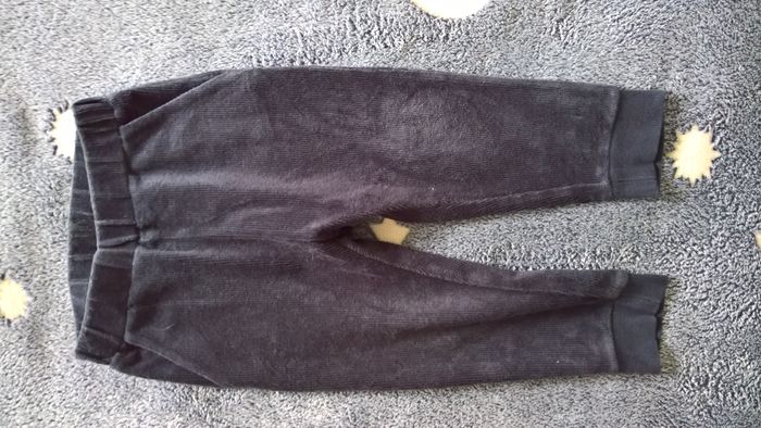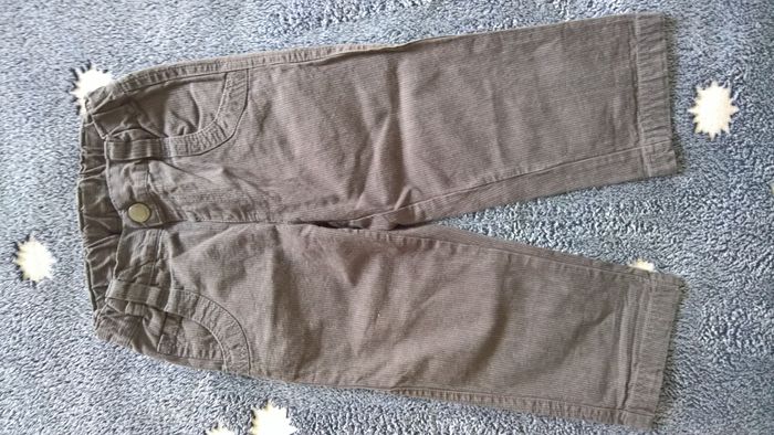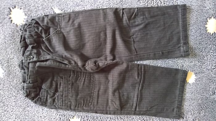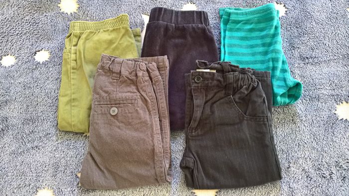 Lot 5 pantalons garçon mi-saison 2 ans, composé selon l'ordre des photos - pantalon / jean noir Kimbaloo TBE - pantalon / jean gris Kidkanaï TBE - pantalon kaki Tirelire TBE - pantalon velours noir H&M TBE - pantalon / bas de pyjama rayé DPAM BE