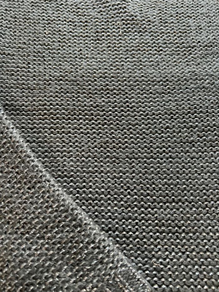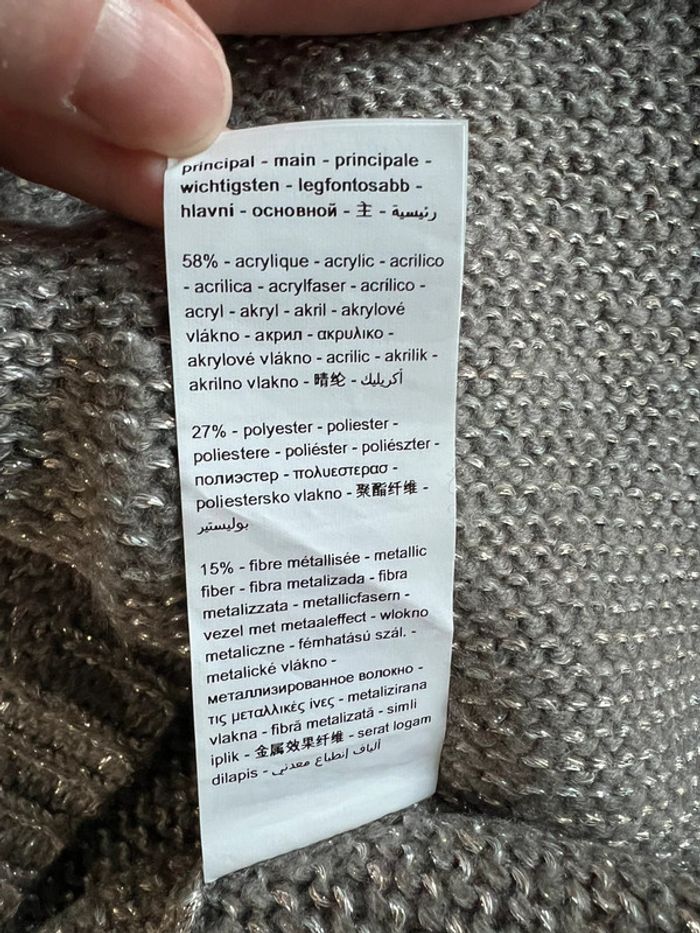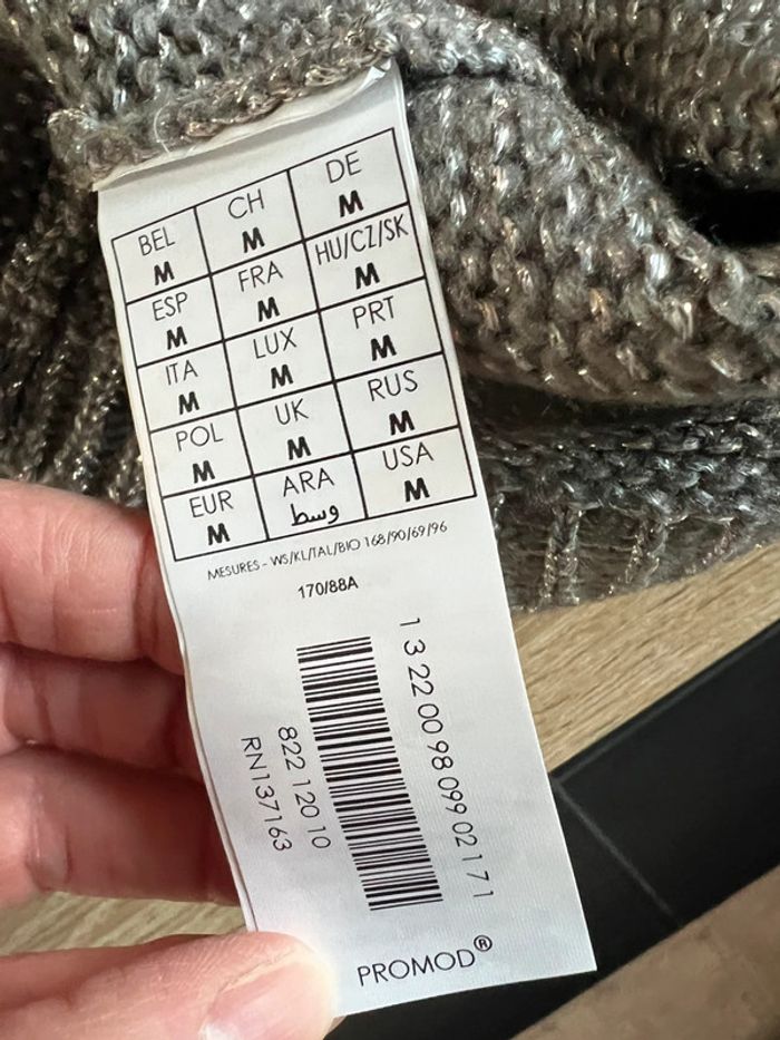 Pull de la marque PROMOD gris avec fils argentés, effet côte de mailles métallisées. Fermeture dans le dos par zip. Très original. Taille M Quelques fils tirés cf photos