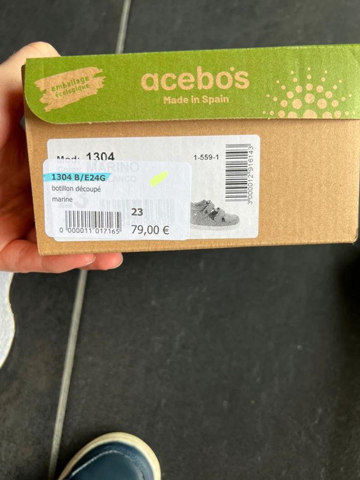 Vends très belle paire de boots botillons ouvertes, idéal pour mi-saison, marque ACEBO’S. Couleur : bleu marine Cuir Scratch Très bonne tenue du pied et de la cheville, idéale pour une marche assurée. Vendue avec sa boîte d’origine Prix d’achat 79€