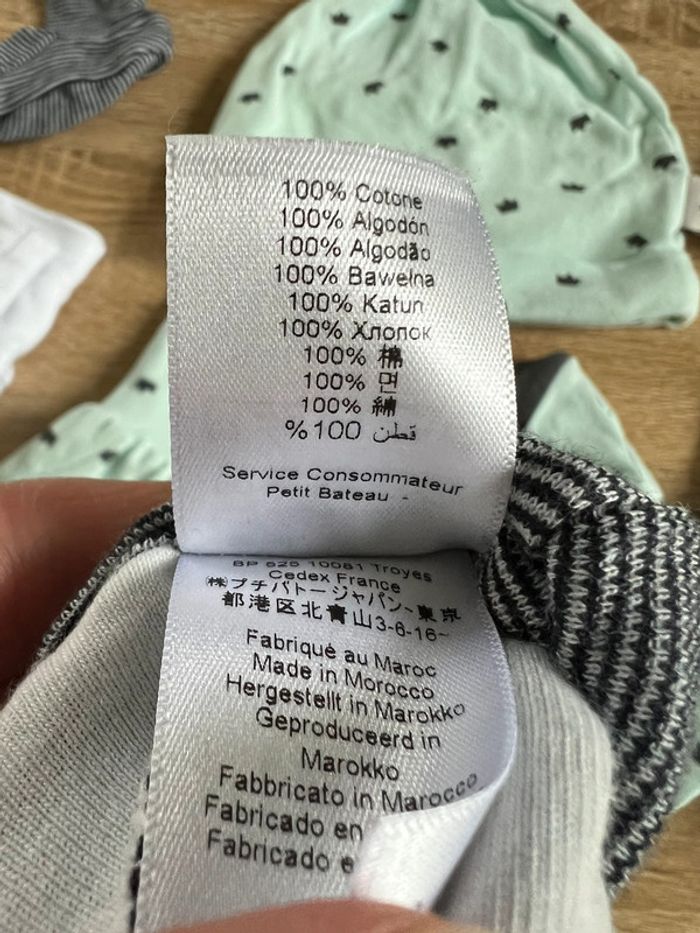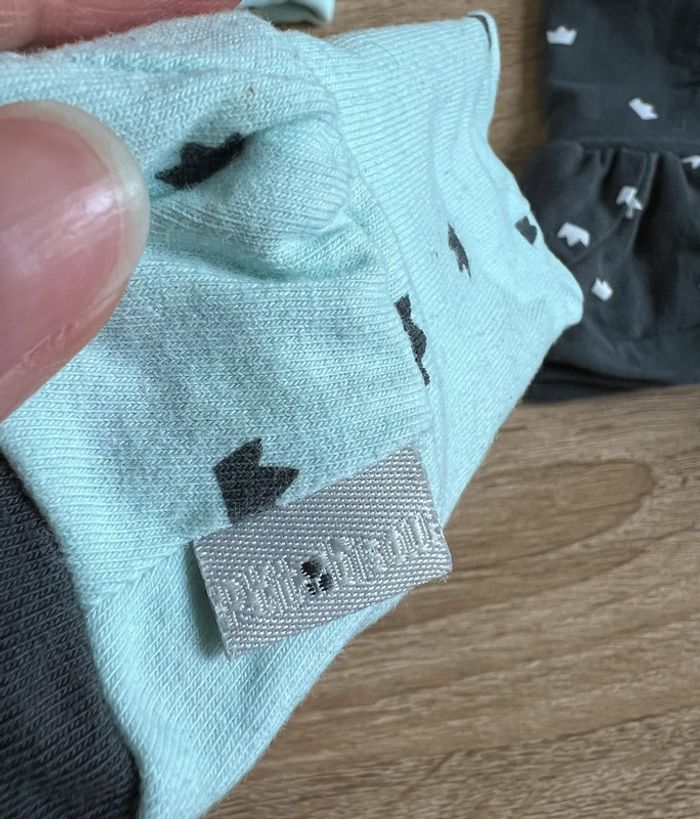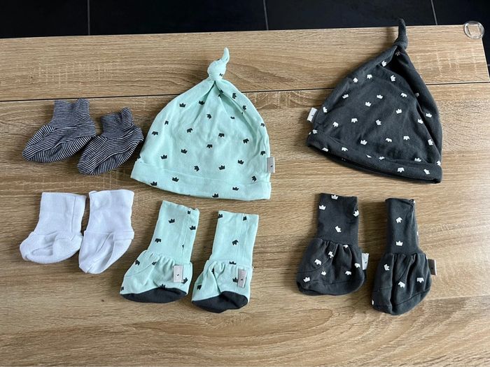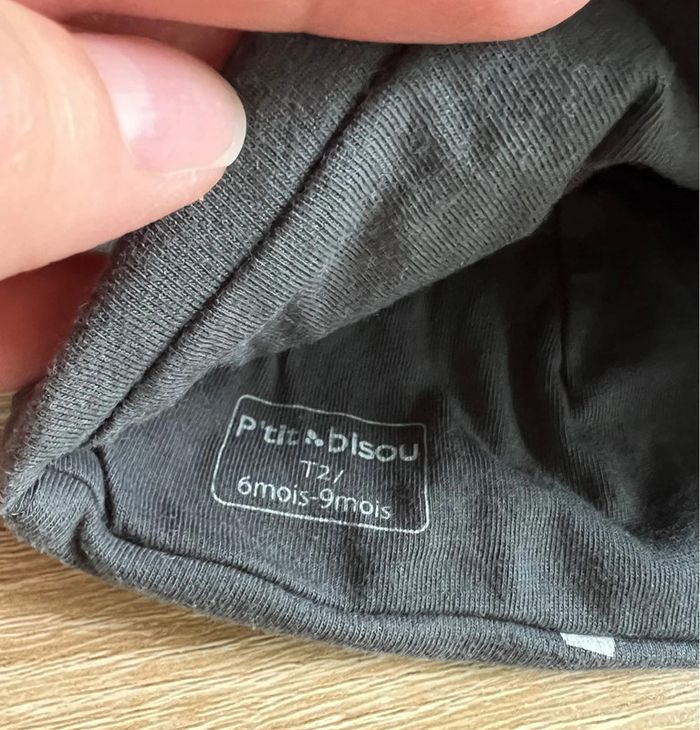 - 2 bonnets avec les paires de chaussettes assorties de la marque P’TIT BISOU: longueur chaussettes 8 cm, taille 6 à 9 mois indiquée sur les bonnets