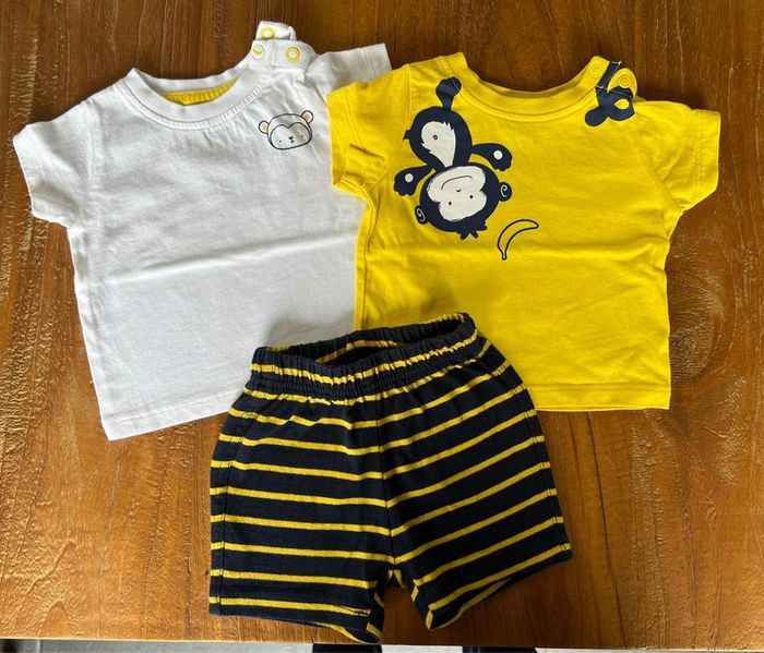 Vends lot de 2 t-shirt avec 1 short souple, parfait pour l’été. Marque LUPILU