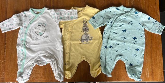 Vends lot de 3 pyjamas en coton légers été, ouverture par pressions sur le devant. Taille 1 mois 2 de la marque KIABI et 1 de la marque SMILEY.