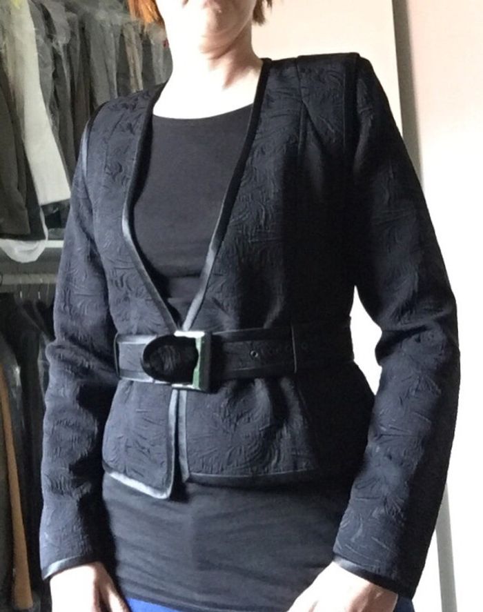 vends magnifique veste de la marque MNG COLLECTION. Couleur noire, fermée par bouton et ceinture. Portée 2 fois Suite à prise de poids je ne rentre plus dedans, donc ne me demandez pas d’autre photo 😋 Je vends beaucoup d’autres articles de marques: Zadig & Voltaire, Karen Millen, LEE, Mango, Zara, Comptoir des Cotonniers Taille M Dimensions prises à plat: - sous les bras : 37 cm - longueur (sous le bras/bas) : 26 cm Matière: 70% coton, 30% polyamide Comme vous le voyez, elle est trop juste pour moi maintenant ;)