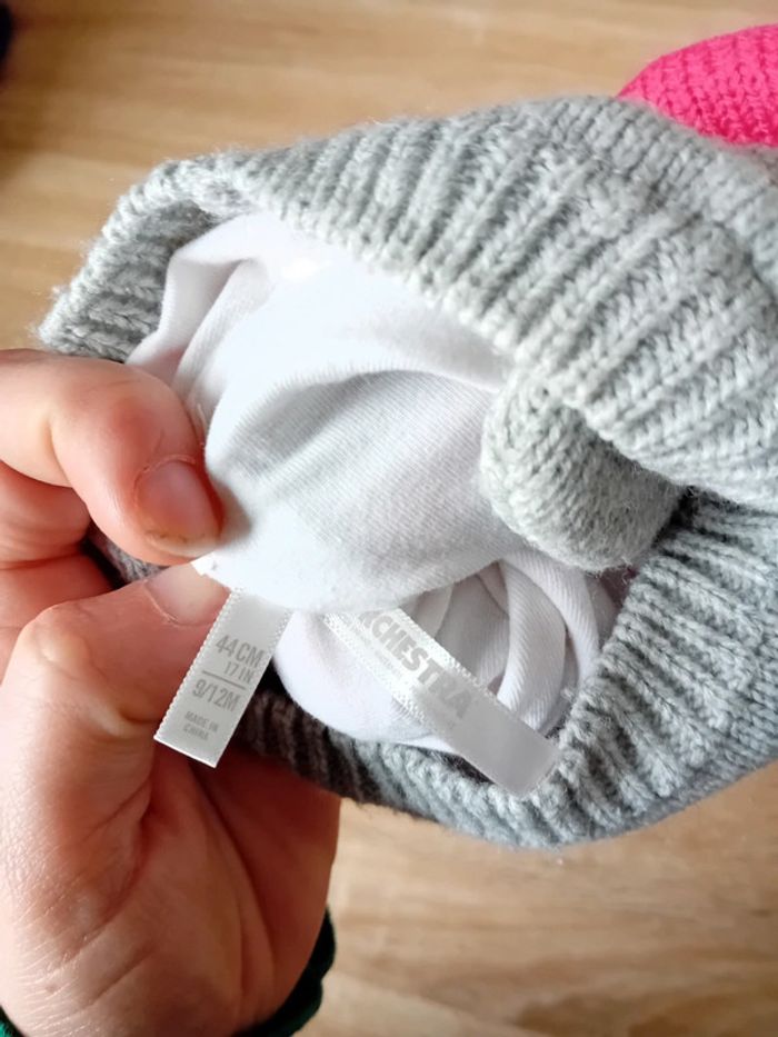 A vendre ☀️tres jolie bonnet ideale pour la saison ☀️orchestra ☀️43cm soit 9/12 mois ☀️gris et rose ☀️très bon état