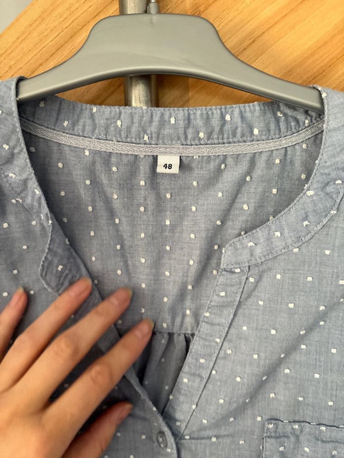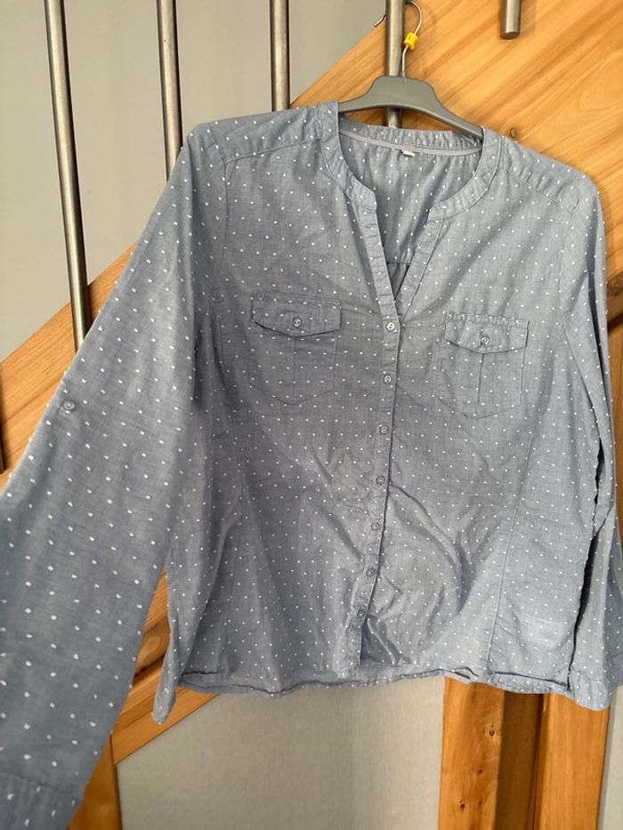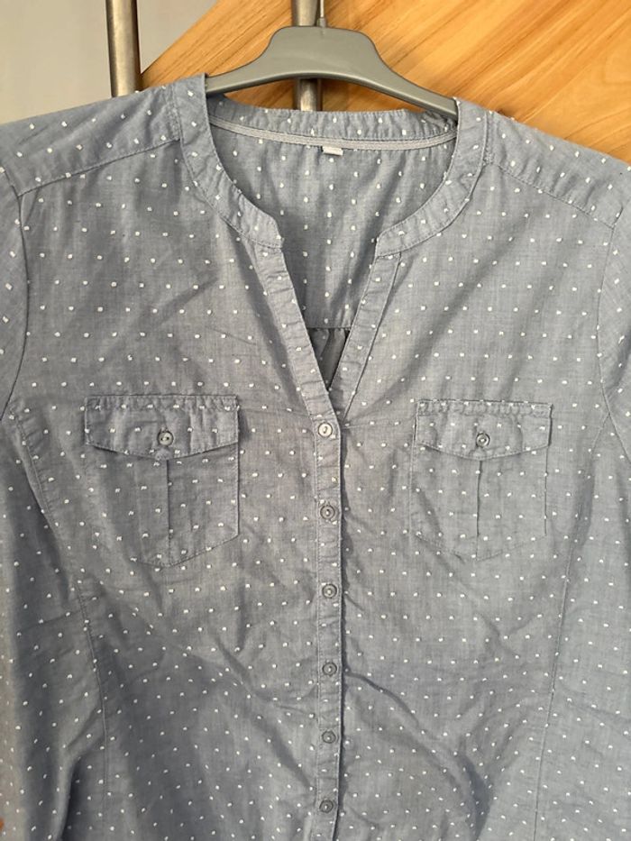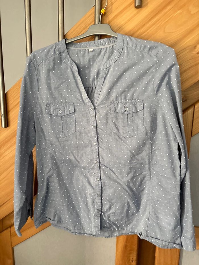Chemise bleu clair a pois blanc en relief Col V femme Ecrit 48 mais taille L Excellent etat