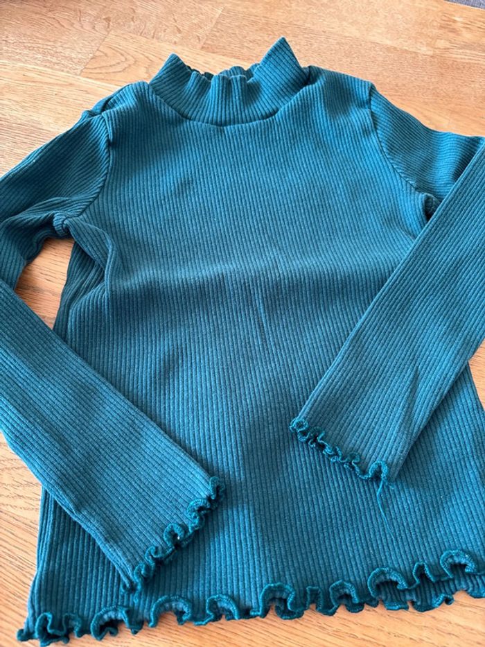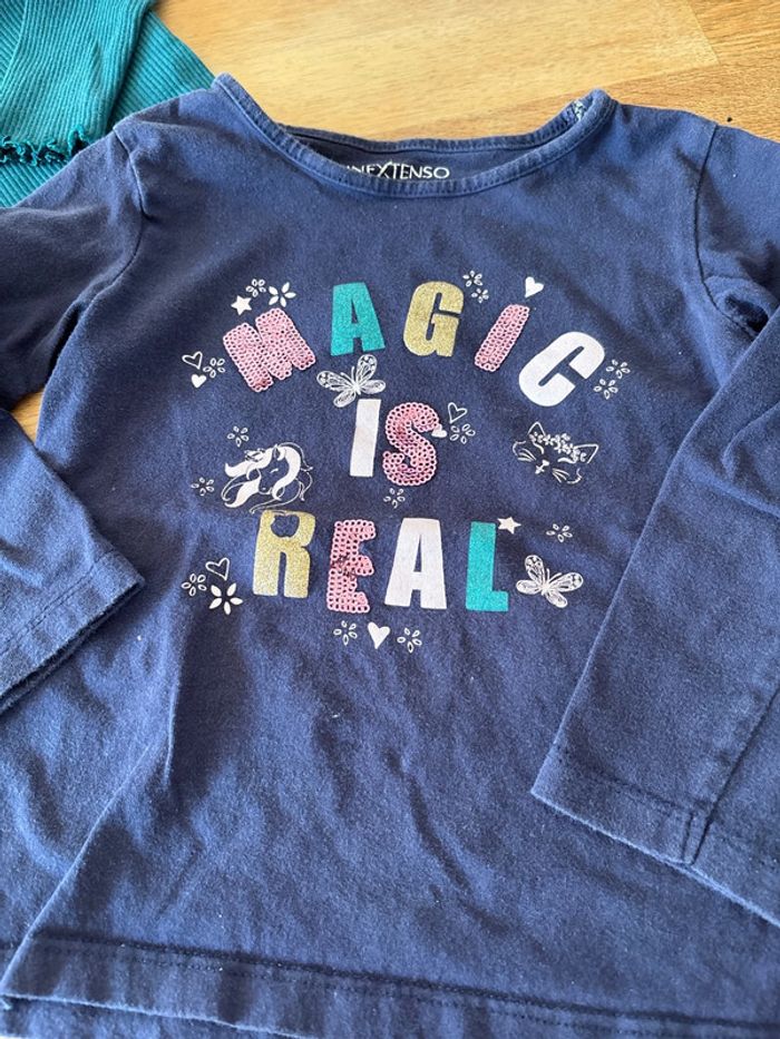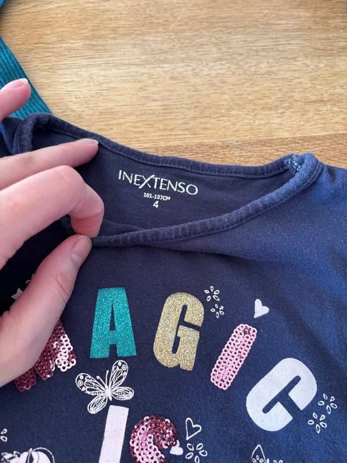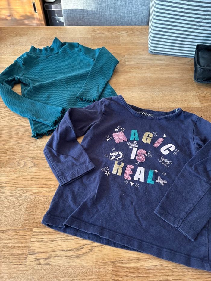 Lot de 2 tshirts manches longues en 4 ans 1 bleu marine avec paillettes et dessin in extenso 1 bleu canard avec col montant et froufrou