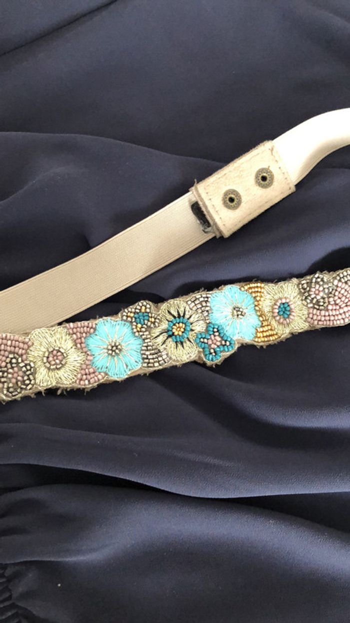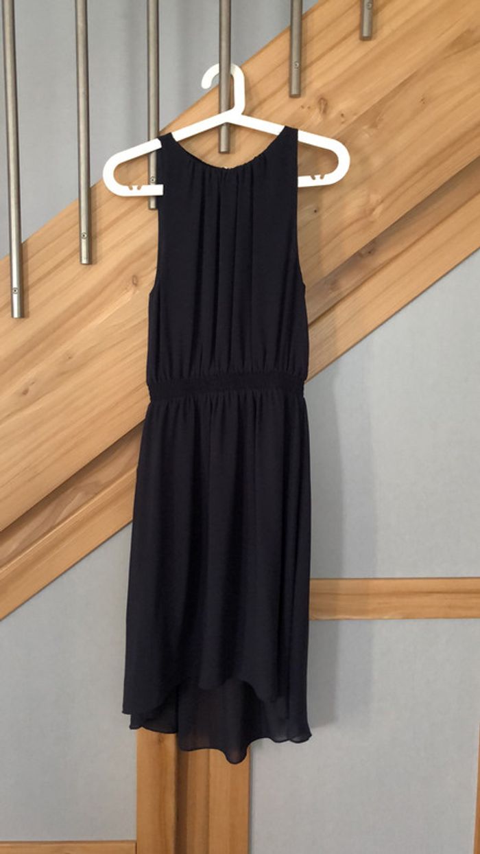 tres jolie robe fluide bleu marine taille élastique vendue avec une ceinture de perle élastique (parfois valeur 20€) portée 2 heures