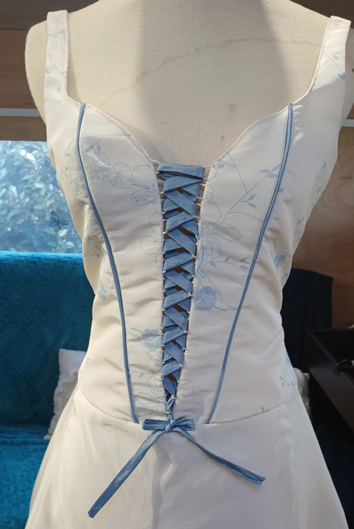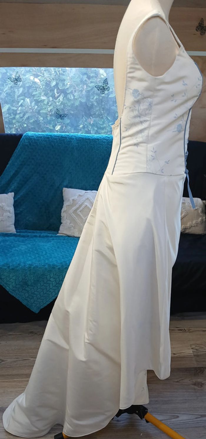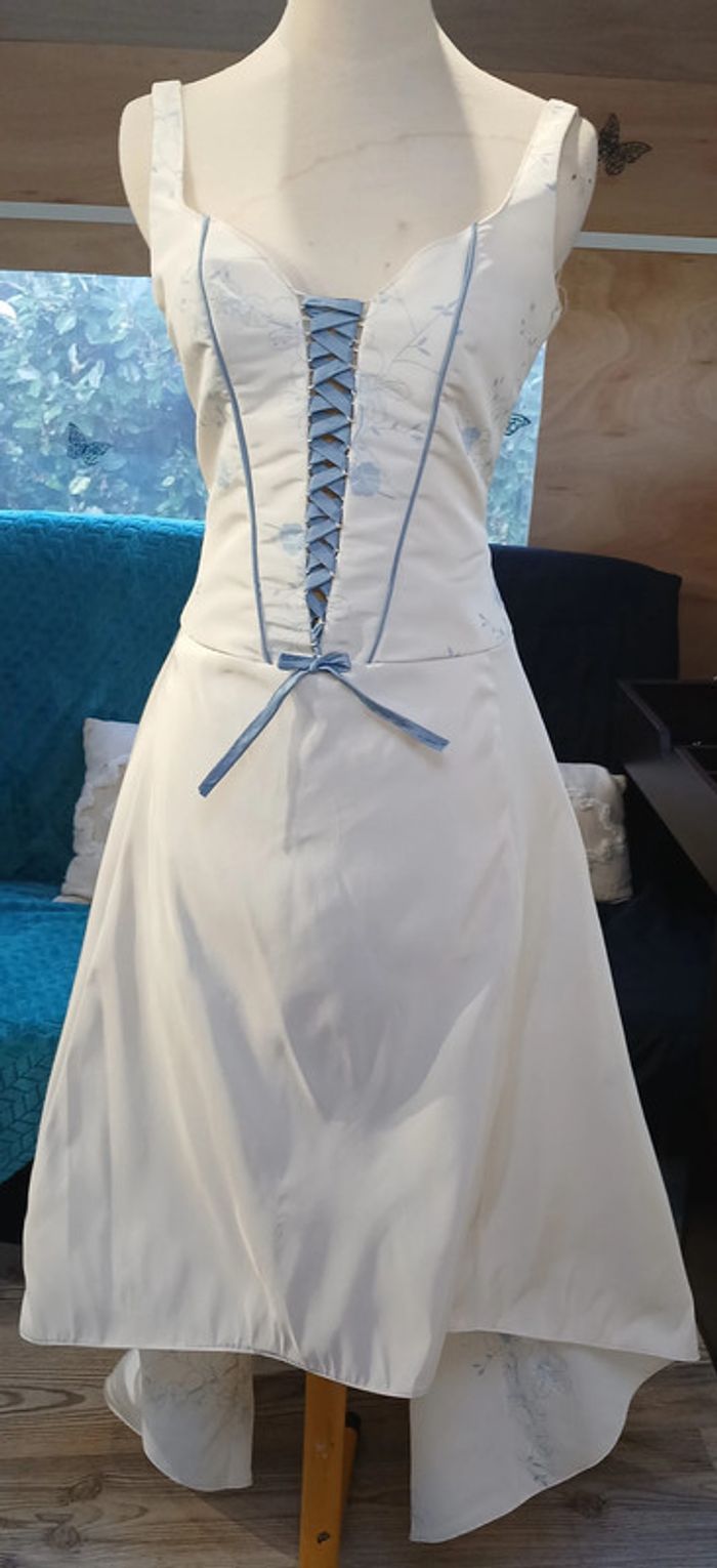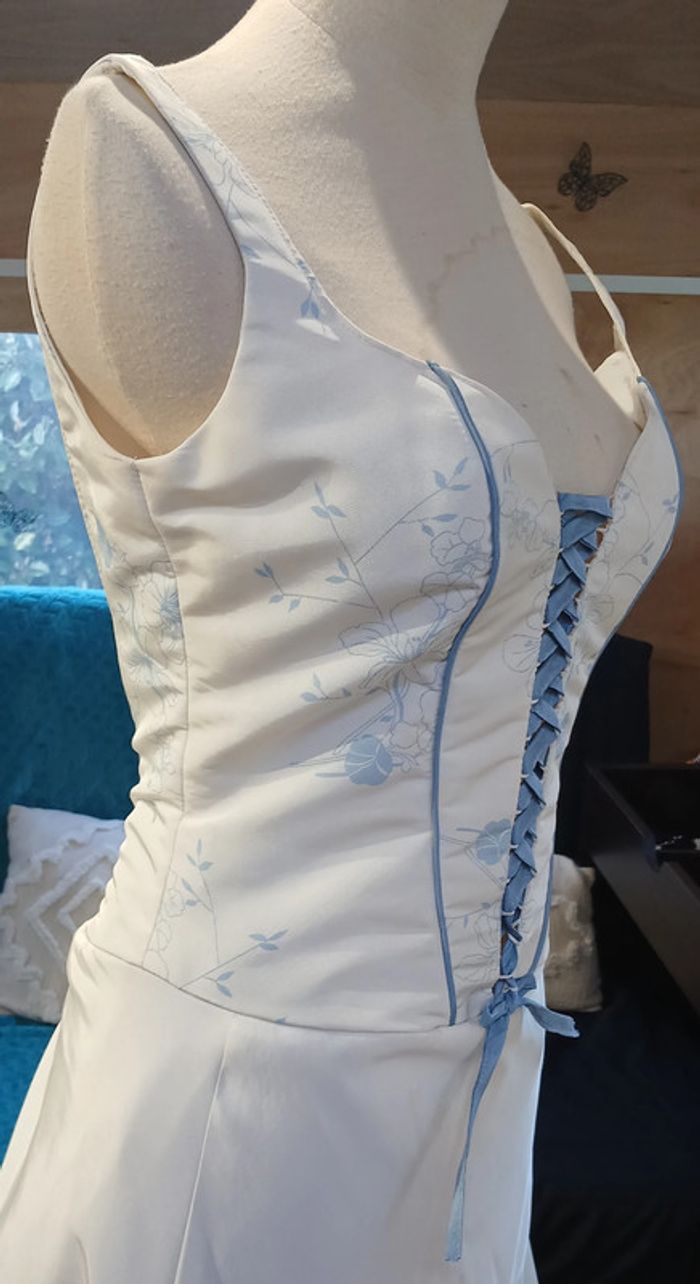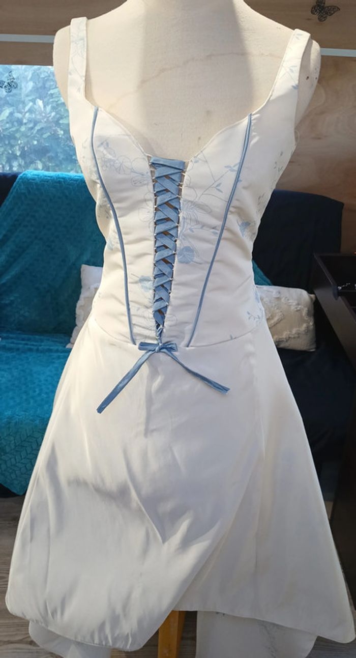 https://metarobecouture.wixsite.com/metarobe/robe-de-mari-e Robe de mariée unique taille 34/36 unique, modifiée par MétaRobe couleur crème/ivoire et bleu clair bas asymétrique laçage devant fermeture éclair au dos dos très echancré tissus de sous la jupe identique à celui du corsage ref : XS-079 Toutes mes robes de mariées sont ajustables et modifiables selon les goûts et rêves de la future mariée. Devis avant tous travaux Photos portées issues de mon défilé lors de mon salon du mariage à Sorbier (03). #metarobemariee #metarobeXS #metarobe36