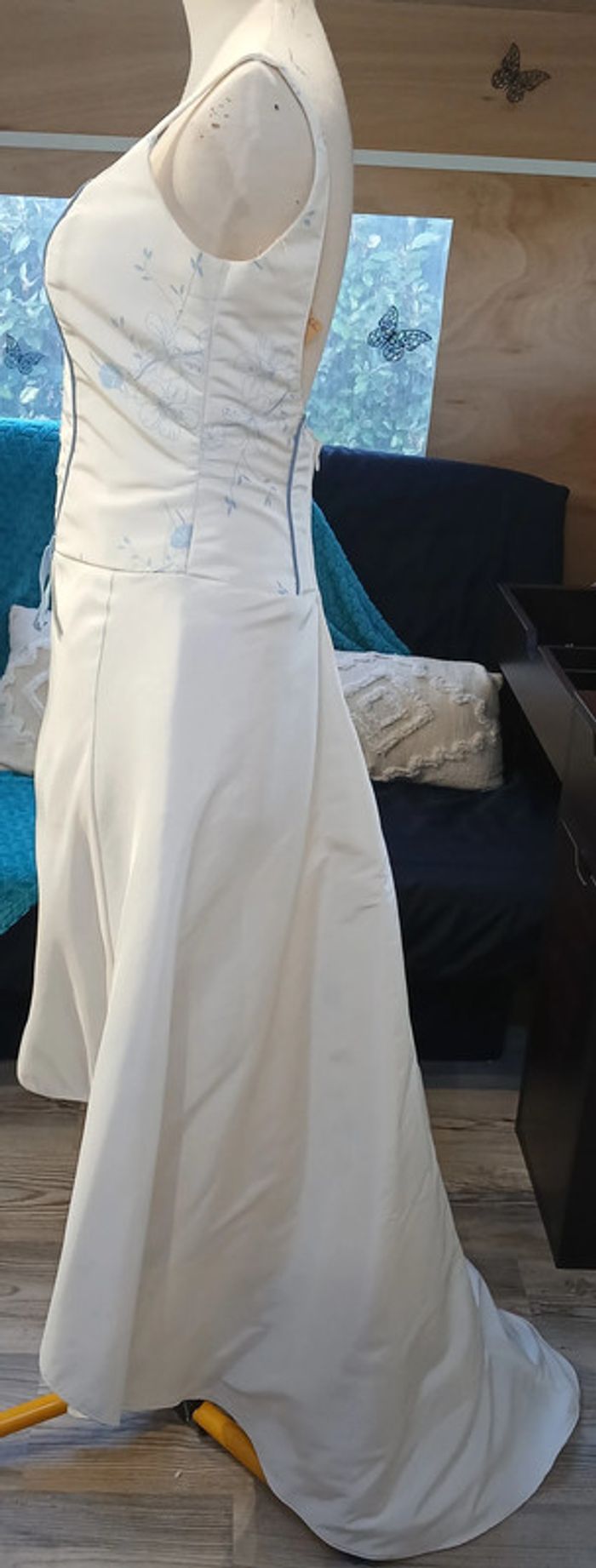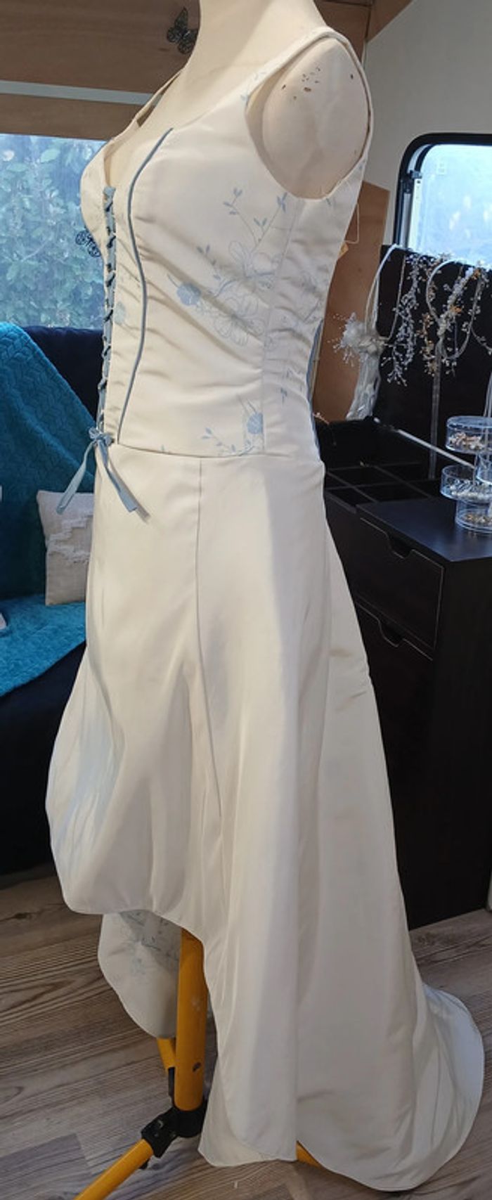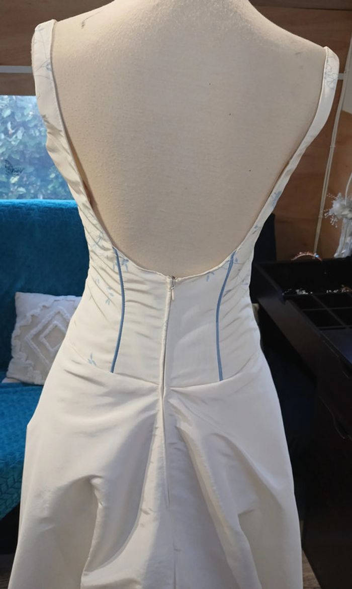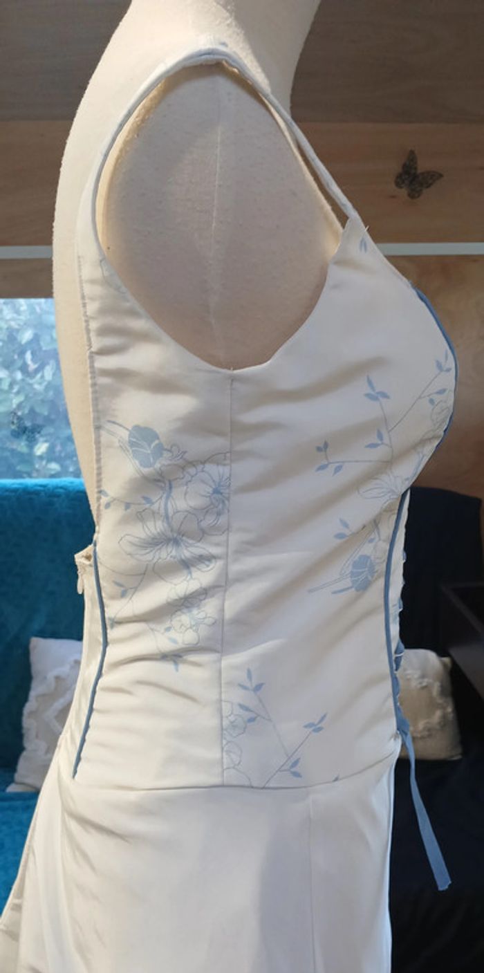 https://metarobecouture.wixsite.com/metarobe/robe-de-mari-e Robe de mariée unique taille 34/36 unique, modifiée par MétaRobe couleur crème/ivoire et bleu clair bas asymétrique laçage devant fermeture éclair au dos dos très echancré tissus de sous la jupe identique à celui du corsage ref : XS-079 Toutes mes robes de mariées sont ajustables et modifiables selon les goûts et rêves de la future mariée. Devis avant tous travaux Photos portées issues de mon défilé lors de mon salon du mariage à Sorbier (03). #metarobemariee #metarobeXS #metarobe36