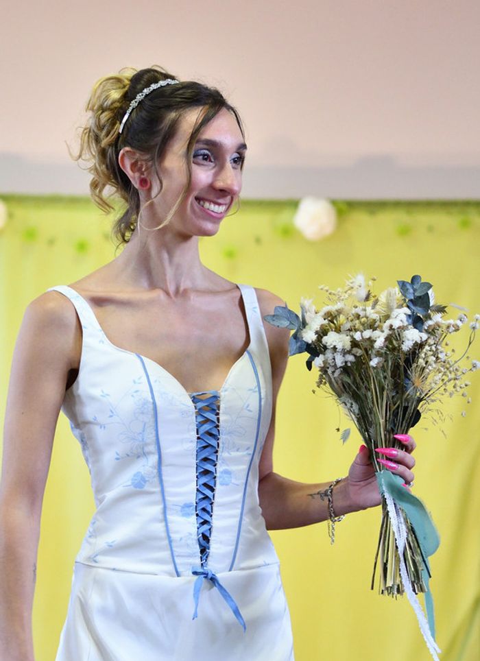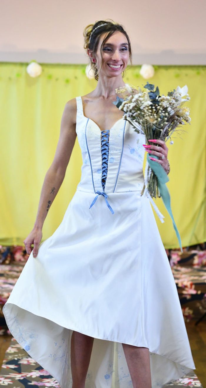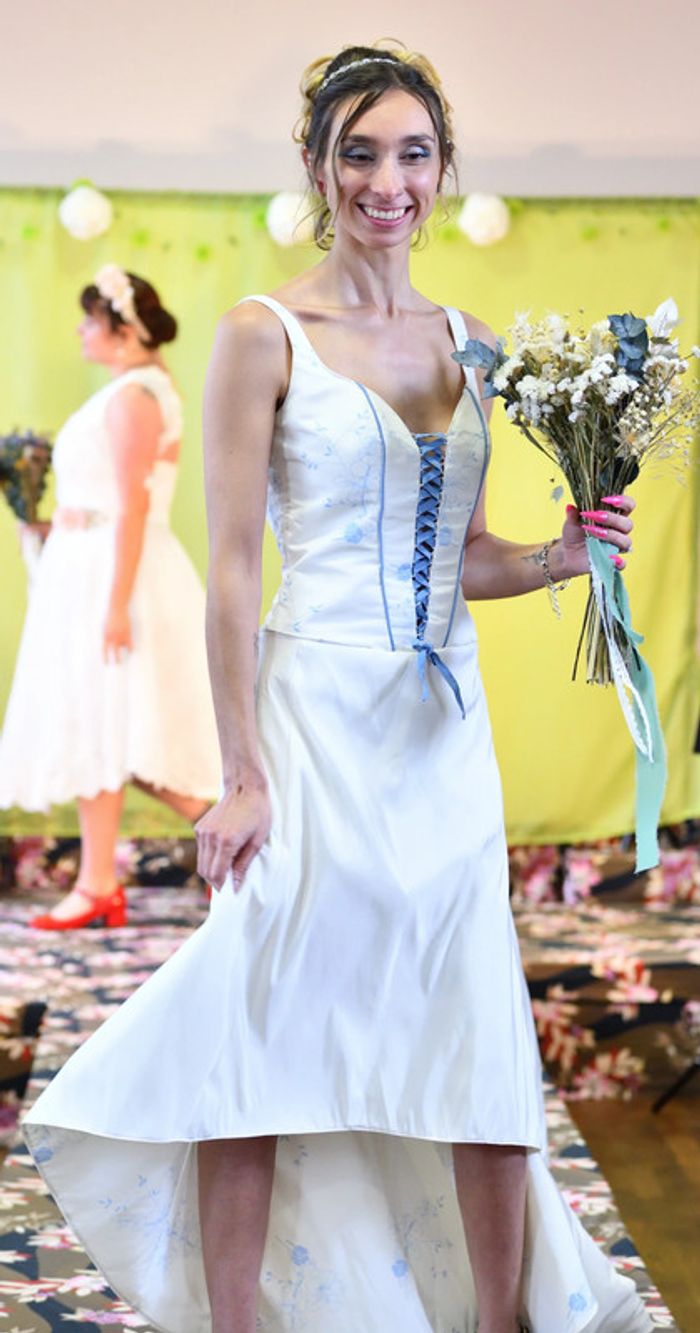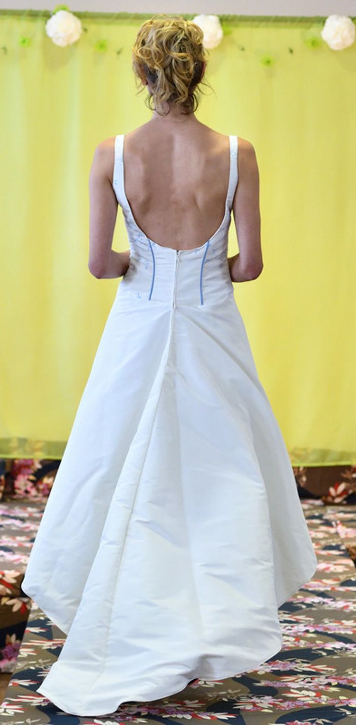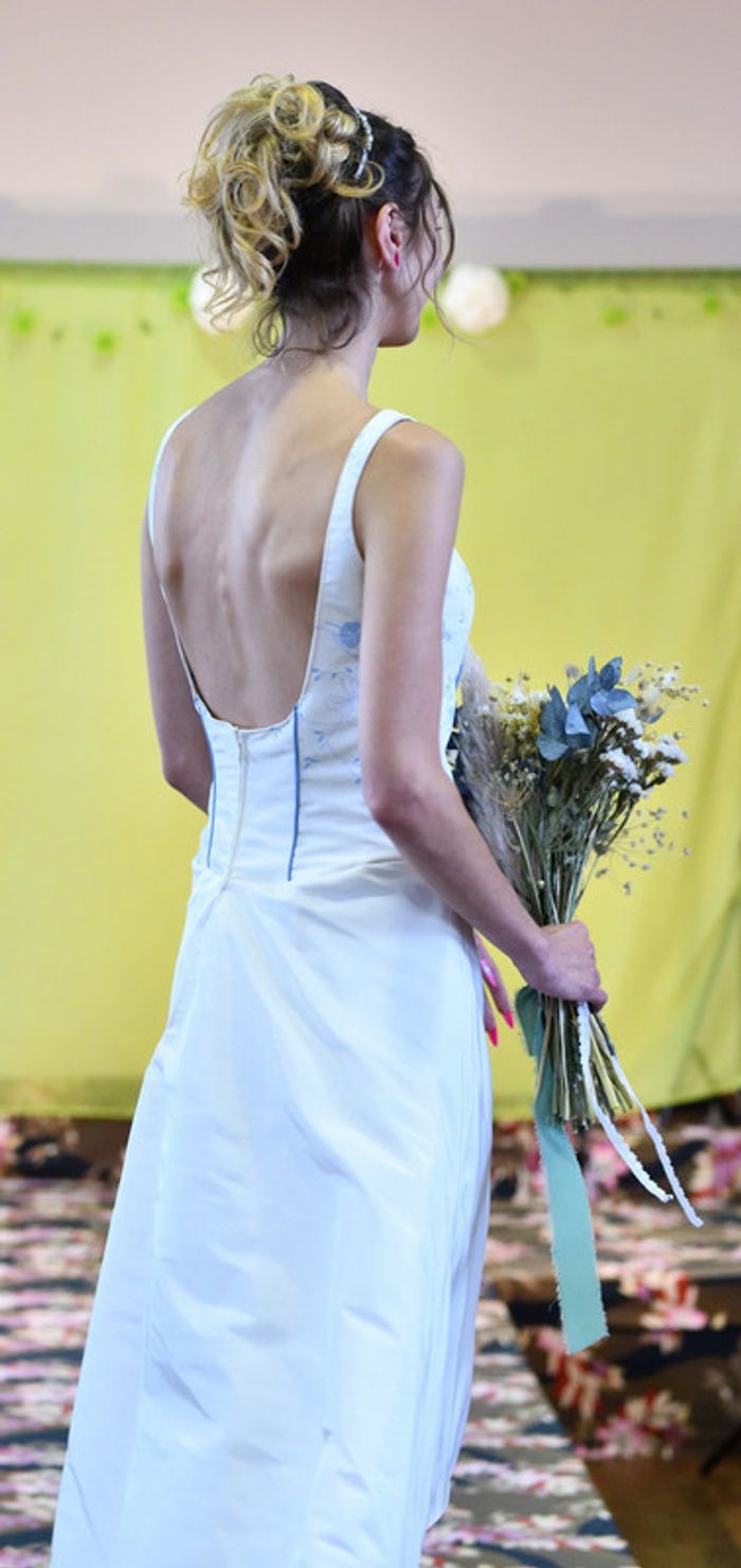 https://metarobecouture.wixsite.com/metarobe/robe-de-mari-e Robe de mariée unique taille 34/36 unique, modifiée par MétaRobe couleur crème/ivoire et bleu clair bas asymétrique laçage devant fermeture éclair au dos dos très echancré tissus de sous la jupe identique à celui du corsage ref : XS-079 Toutes mes robes de mariées sont ajustables et modifiables selon les goûts et rêves de la future mariée. Devis avant tous travaux Photos portées issues de mon défilé lors de mon salon du mariage à Sorbier (03). #metarobemariee #metarobeXS #metarobe36