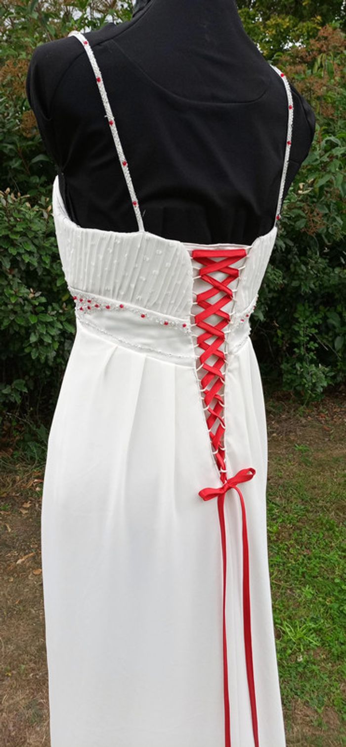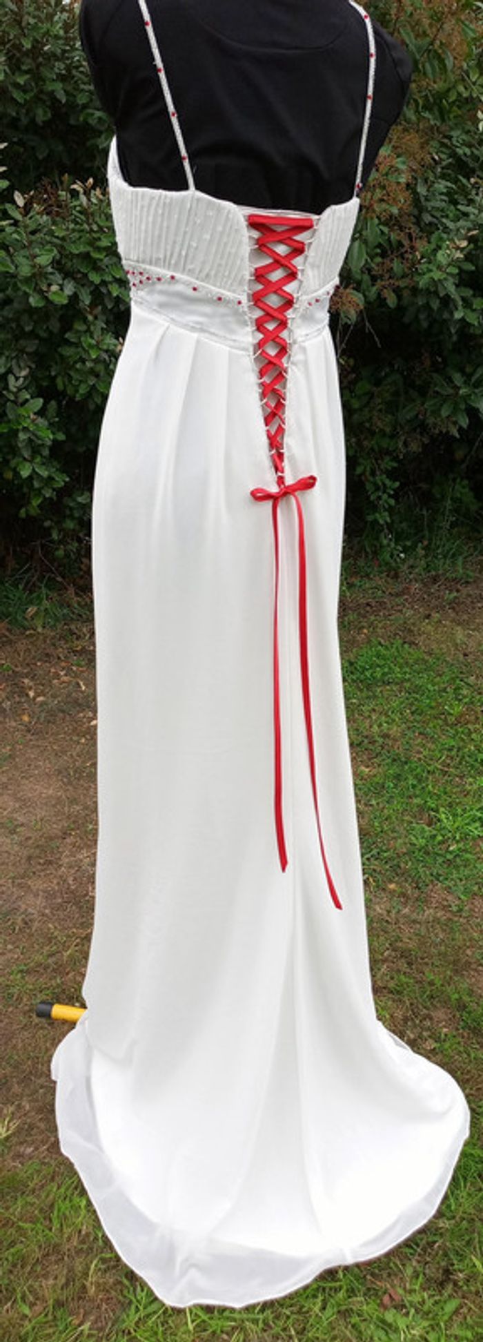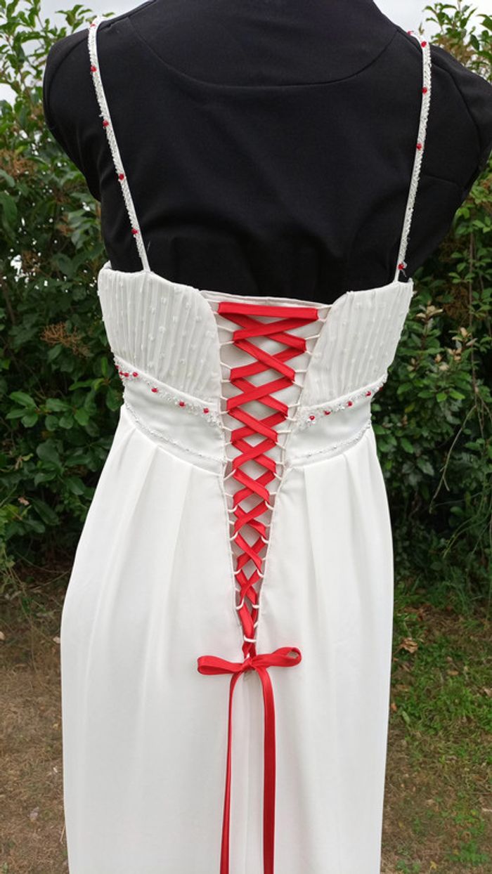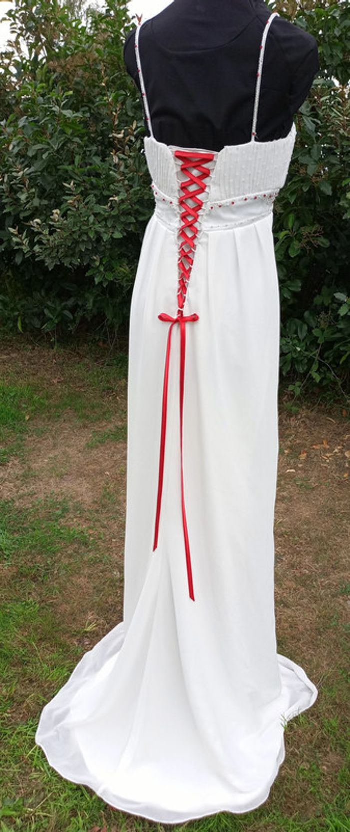 https://metarobecouture.wixsite.com/metarobe/robe-de-mari-e robe de mariée unique, modifiée par Métarobe taille 38/40 ( mannequin taille 38) en voilage, doublée style fluide bohème champêtre crème et rouge (possibilité d'une autre couleur de ruban, me demander) ref : L-270 retour possible jusqu’à 14 jours après réception du colis si la robe ne convient pas Toutes mes robes de mariées sont ajustables et modifiables selon les goûts et rêves de la future mariée. Devis avant tous travaux #metarobemariee #metarobe38 #metarobeL