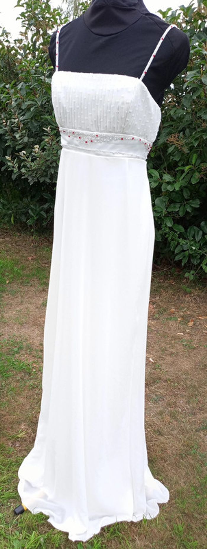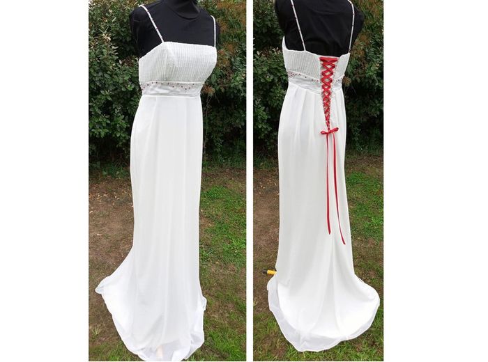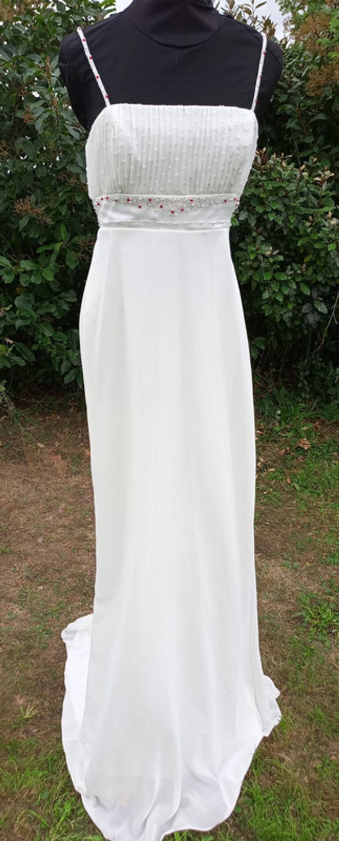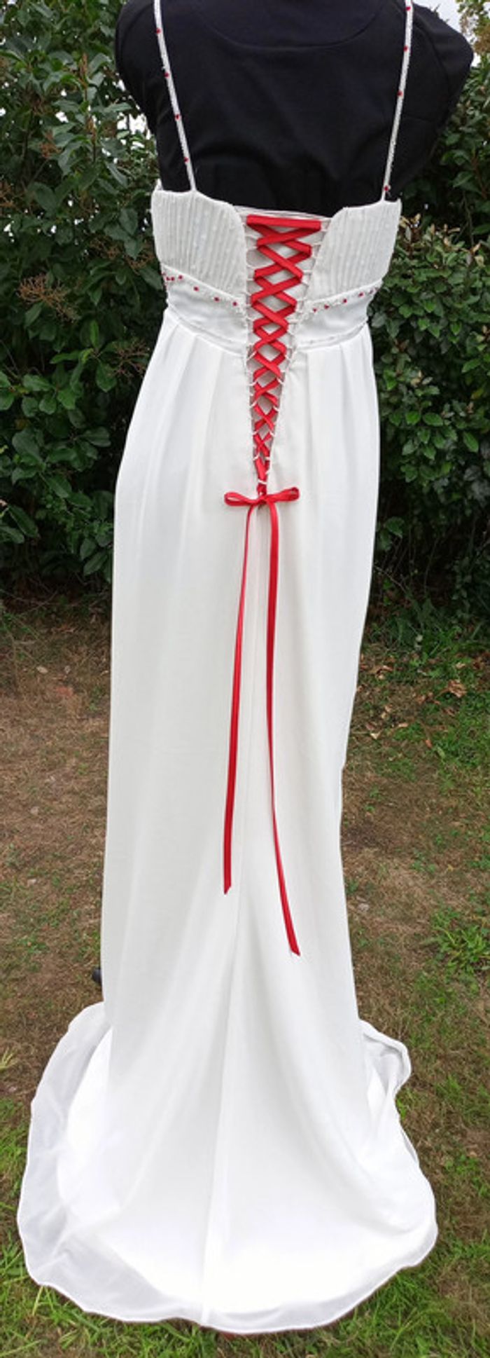 https://metarobecouture.wixsite.com/metarobe/robe-de-mari-e robe de mariée unique, modifiée par Métarobe taille 38/40 ( mannequin taille 38) en voilage, doublée style fluide bohème champêtre crème et rouge (possibilité d'une autre couleur de ruban, me demander) ref : L-270 retour possible jusqu’à 14 jours après réception du colis si la robe ne convient pas Toutes mes robes de mariées sont ajustables et modifiables selon les goûts et rêves de la future mariée. Devis avant tous travaux #metarobemariee #metarobe38 #metarobeL
