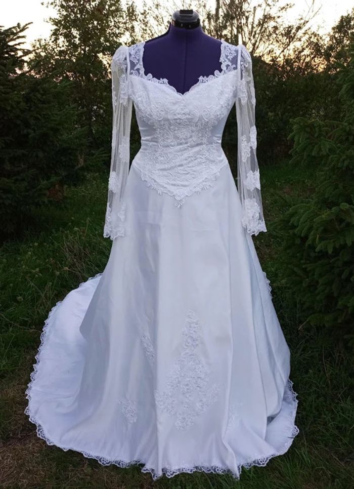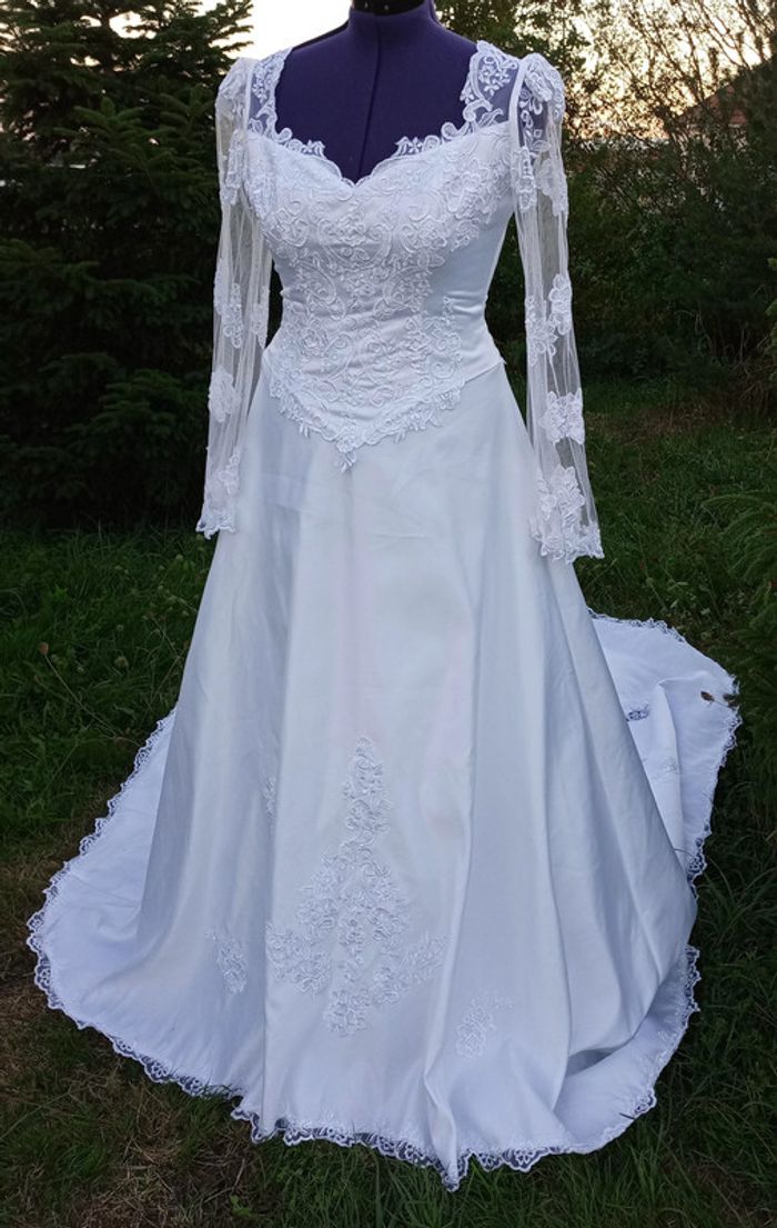 https://metarobecouture.wixsite.com/metarobe/robe-de-mari-e Robe de mariée unique, modifiée par MétaRobe taille 42/44 blanche manches longues zippée dans le dos ( possibilité d'ajouter un laçage + 50 €) traine avec dentelle ajourée photos prises sans jupon , peut être portée avec un jupon traine ( non vendu avec) ref : 2XL-076 retour possible jusqu’à 14 jours après réception du colis si la robe ne convient pas Toutes mes robes de mariées sont ajustables et modifiables selon les goûts et rêves de la future mariée. Devis avant tous travaux #metarobe2XL #metarobeXL #metarobemariee