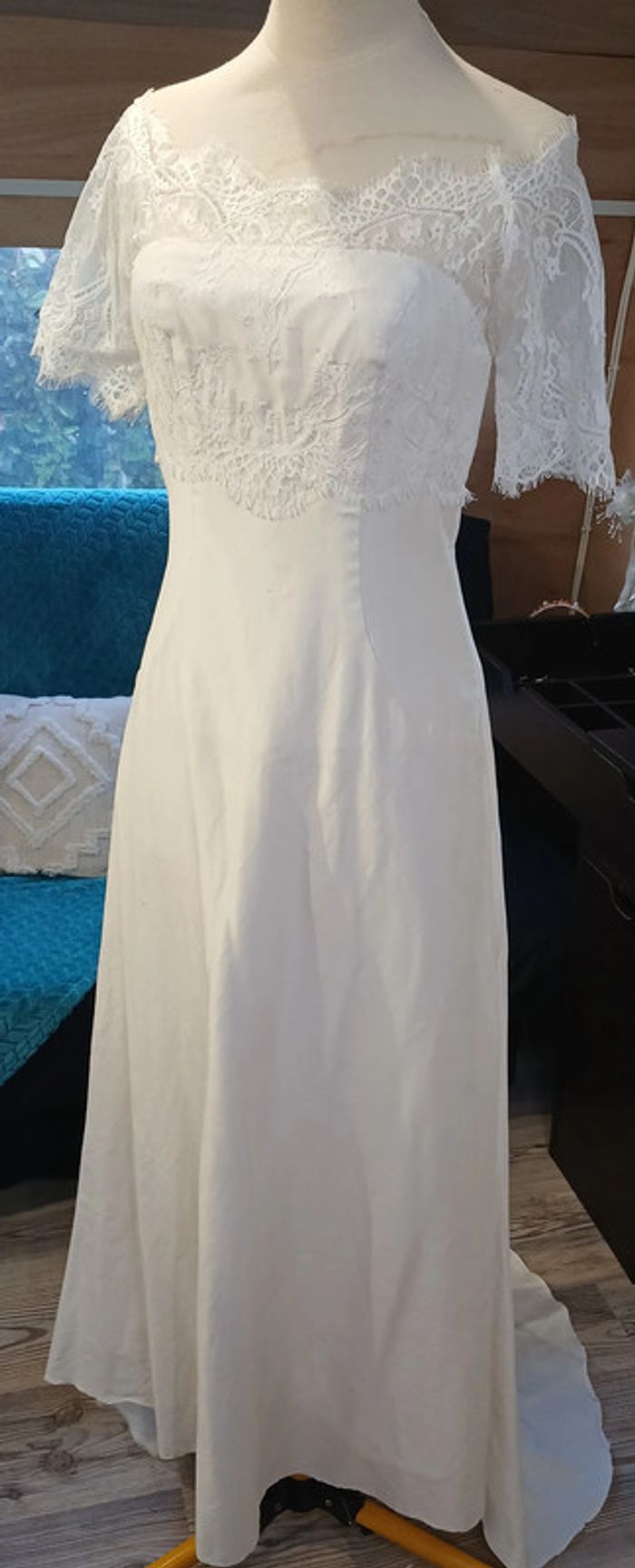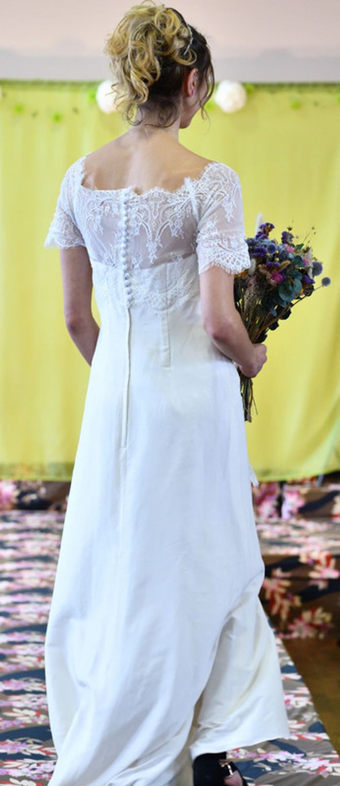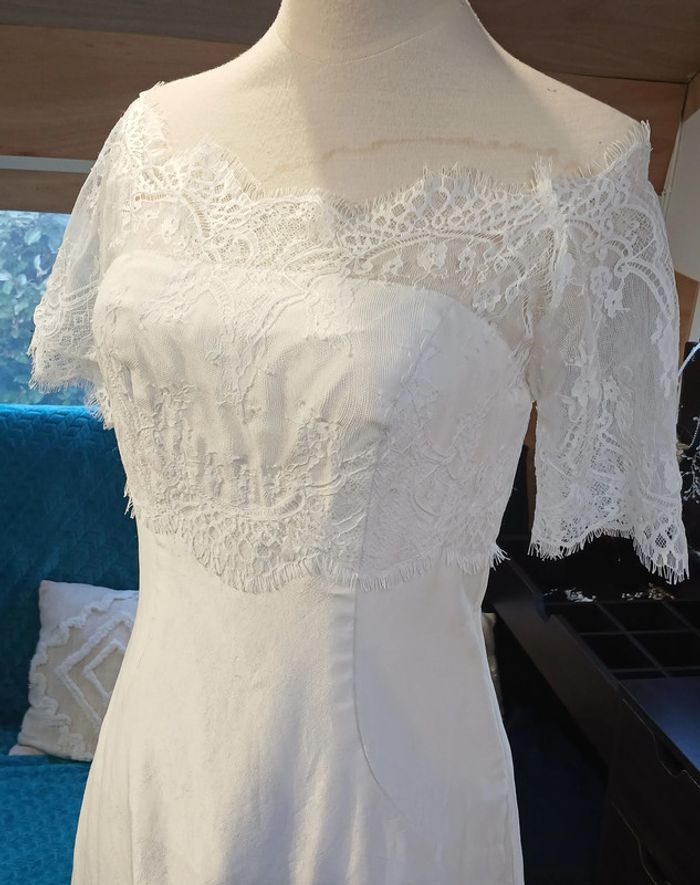 https://metarobecouture.wixsite.com/metarobe/robe-de-mari-e robe de mariée unique, modifiée par MétaRobe taille 36 ( photos portées, taille 34) robe en partie en soie doublée épaules dénudées ou dentelle sur les épaules boutonnée et zippée dans le dos ref : S-134 retour possible jusqu’à 14 jours après réception du colis si la robe ne convient pas Toutes mes robes de mariées sont ajustables et modifiables selon les goûts et rêves de la future mariée. Devis avant tous travaux Photos portées issues de mon défilé lors de mon salon du mariage à Sorbier (03). #metarobemariee #metarobe36