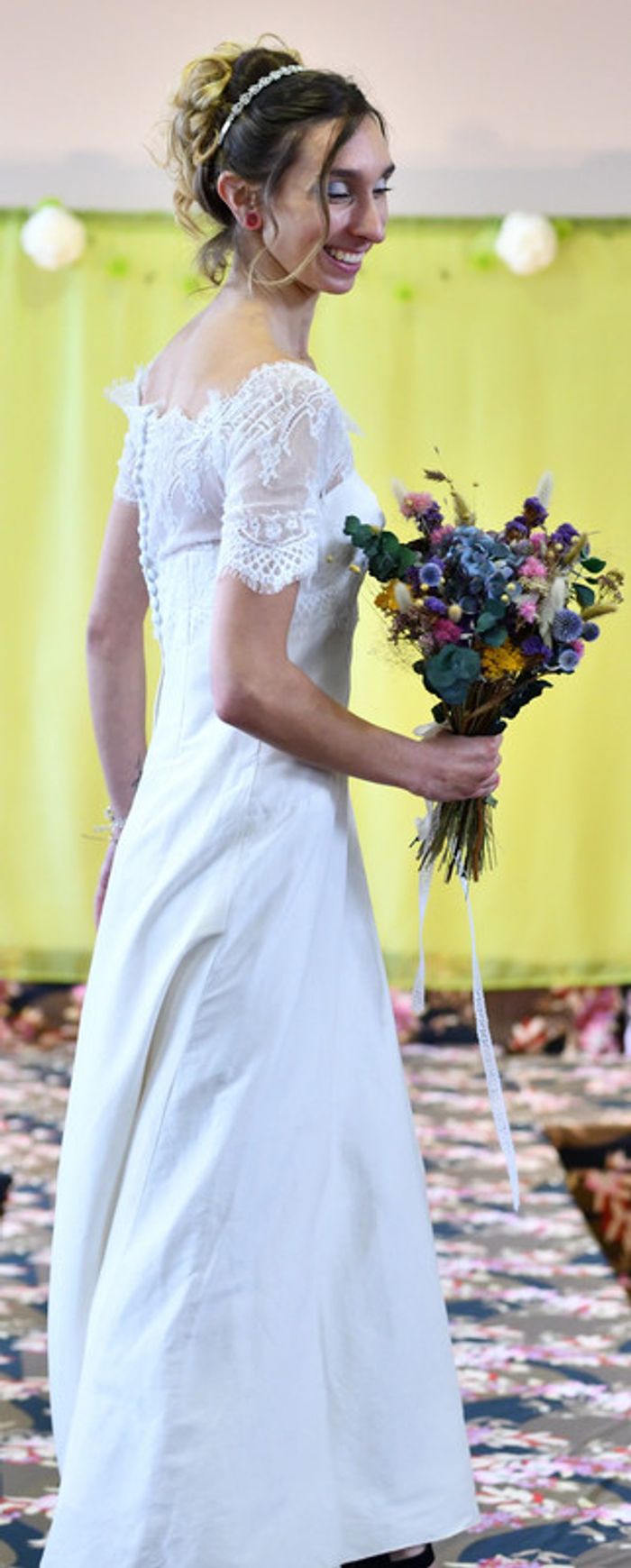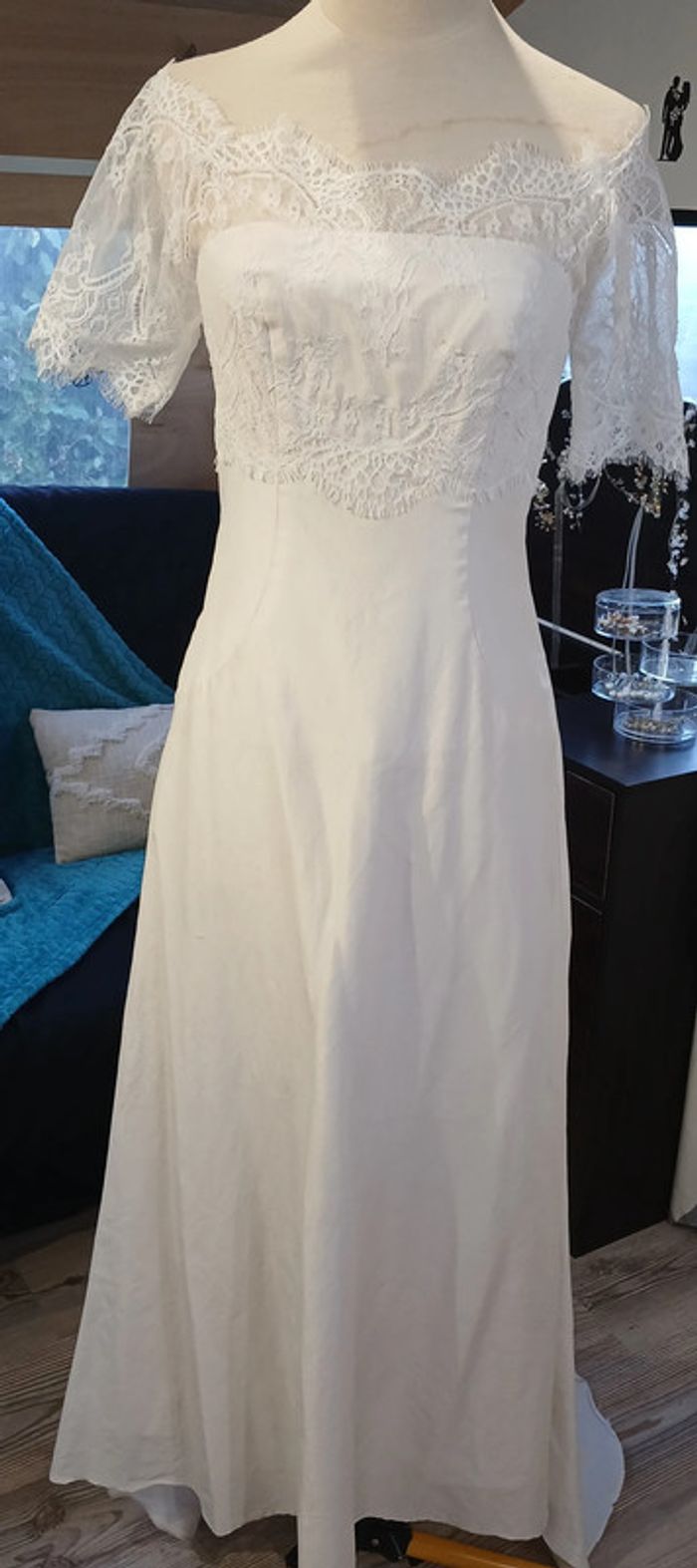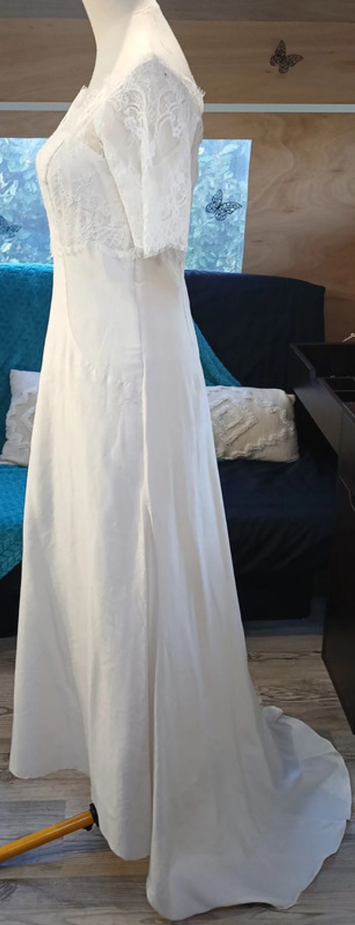 https://metarobecouture.wixsite.com/metarobe/robe-de-mari-e robe de mariée unique, modifiée par MétaRobe taille 36 ( photos portées, taille 34) robe en partie en soie doublée épaules dénudées ou dentelle sur les épaules boutonnée et zippée dans le dos ref : S-134 retour possible jusqu’à 14 jours après réception du colis si la robe ne convient pas Toutes mes robes de mariées sont ajustables et modifiables selon les goûts et rêves de la future mariée. Devis avant tous travaux Photos portées issues de mon défilé lors de mon salon du mariage à Sorbier (03). #metarobemariee #metarobe36