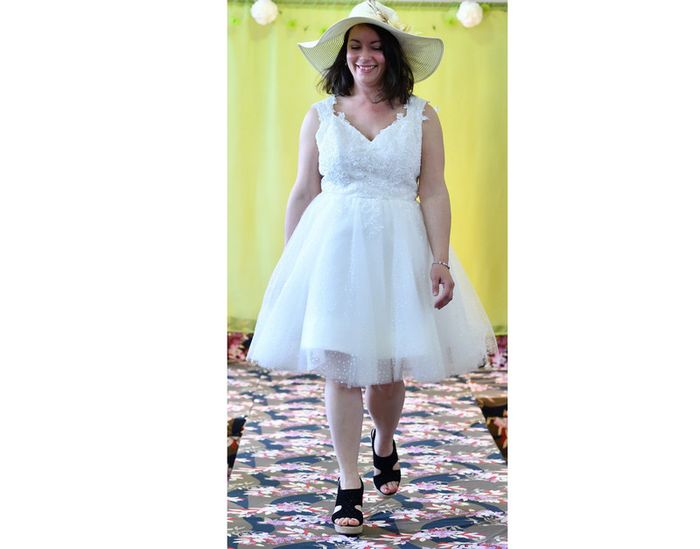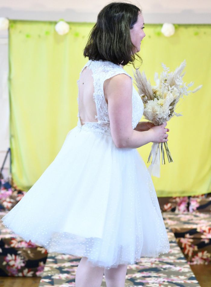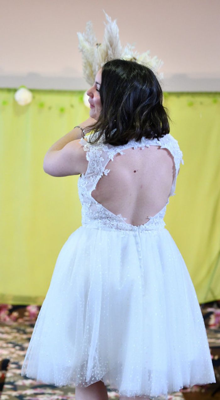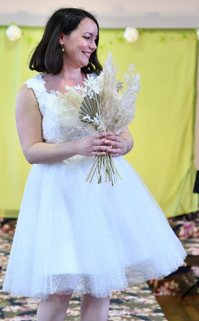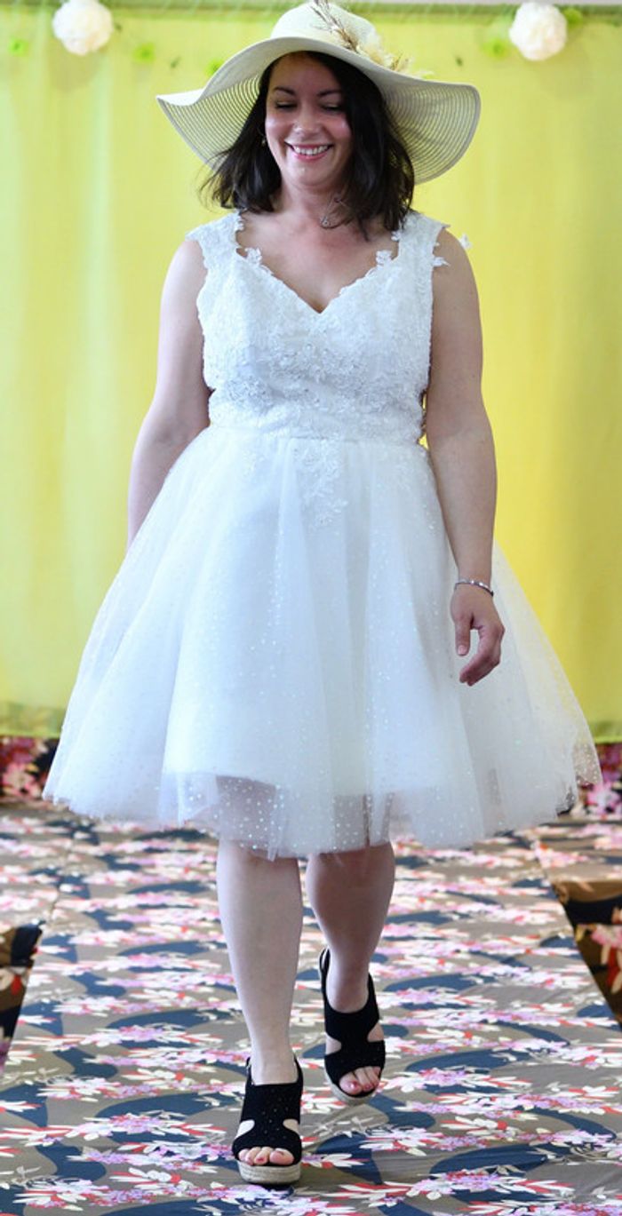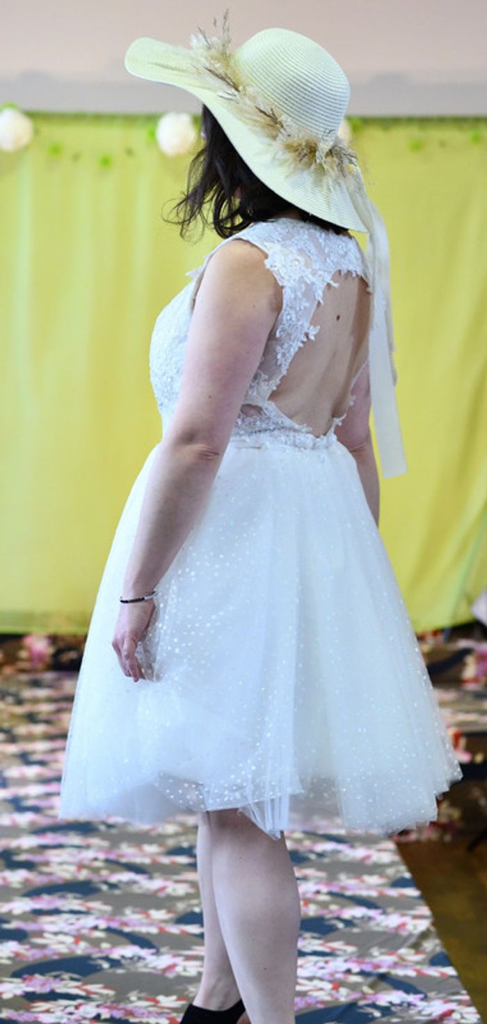 https://metarobecouture.wixsite.com/metarobe/robe-de-mari-e robe de mariée taille 40/42 courte, style pin up rétro haute avec des appliquées de dentelle doublée devant, dos en transparence jupe pailletée couleur crème/ivoire peut se porter avec un jupon pin up dessous ( non vendu avec et non présent sur les photos) zippée dans le dos non ajustée à la personne sur les photos portées tour de poitrine : 95 cm tour de taille : 78 cm ref : XL-097 retour possible jusqu’à 14 jours après réception du colis si la robe ne convient pas Toutes mes robes de mariées sont ajustables et modifiables selon les goûts et rêves de la future mariée. Devis avant tous travaux Photos portées issues de mon défilé lors de mon salon du mariage à Sorbier (03). #metarobemariee #metarobeXL #metarobe2XL
