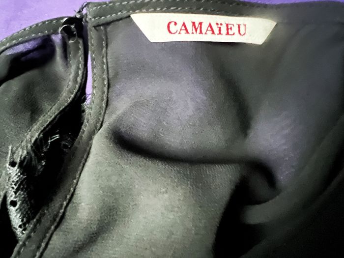 Marque "Camaïeu", comme neuve. Robe de soirée, cérémonie ou fête. Encolure tulle bordée de dentelle, manches courtes en dentelle. Fermeture bouton au dos. Tour de poitrine 92 cm, longueur 90 cm.