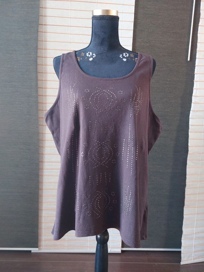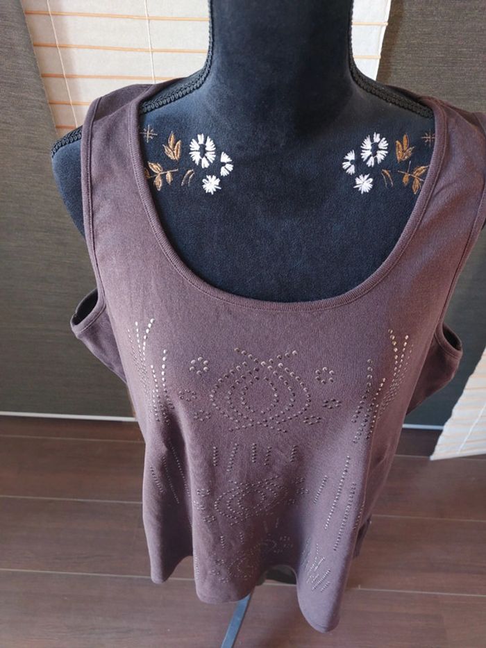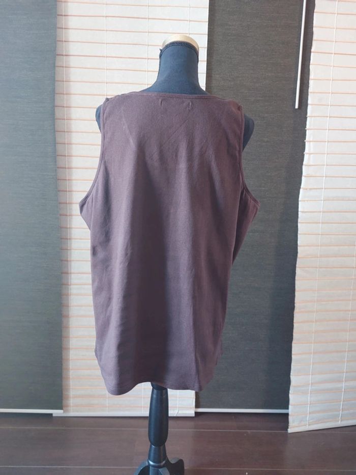 #laetitia8110femmeT50 Longueur aisselle à aisselle 61 cm. La couleur du débardeur est brun. L étiquette avec la taille a été coupée car elle grattait.