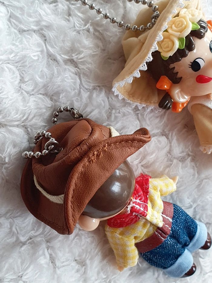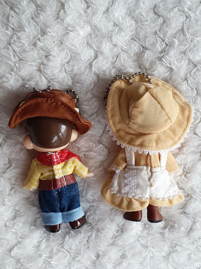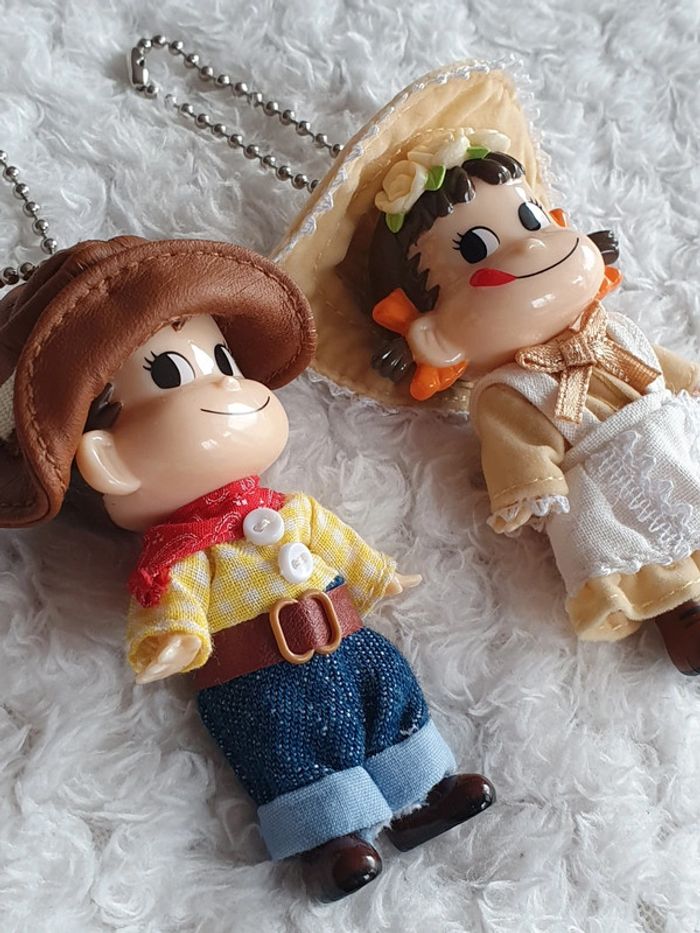 Lot de 2 magnifiques porte clé strap keychain provenant du Japon 🌸✨️ à l'effigie de la mascotte des bonbons Milky PEKO-chan et POKO-chan vêtements de fermiers 🌞 vintage japan toys retro japao giaponne portachiavi 8cm x 4cm