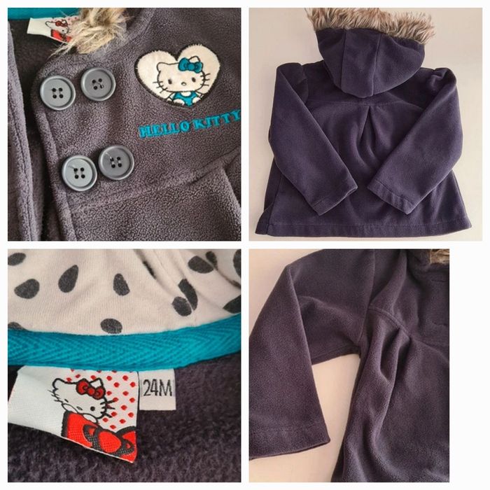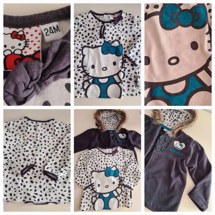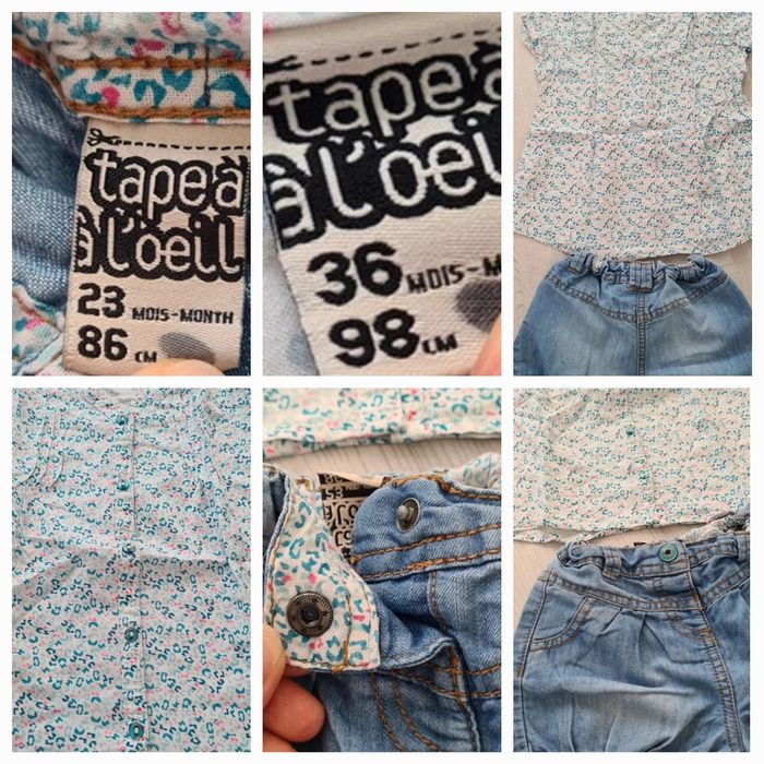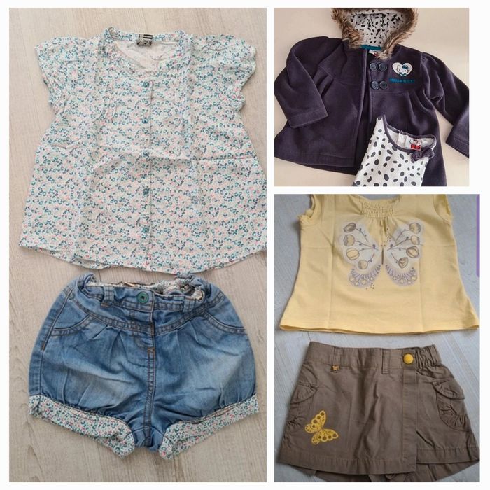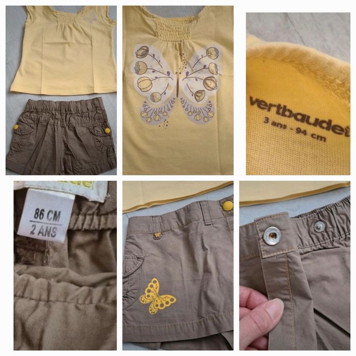 1 ensemble TAO, short bloomer taille ajustable et chemise manches courtes. Ensemble fluide et léger, en viscose et coton. 1 ensemble vertbaudet, short taille ajustable et débardeur. Ensemble léger en coton. Les shorts sont en 24 mois, les hauts en 36 mois 1 veste polaire en coton et polyester et un tee-shirt manches longues en coton hello kitty pour les fraîches nuits d'été, 24 mois. Le tout dans un état proche du neuf. Merci de ne pas négocier le prix, l'ensemble TAO vaut déjà plus cher que le prix demandé pour ce lot.
